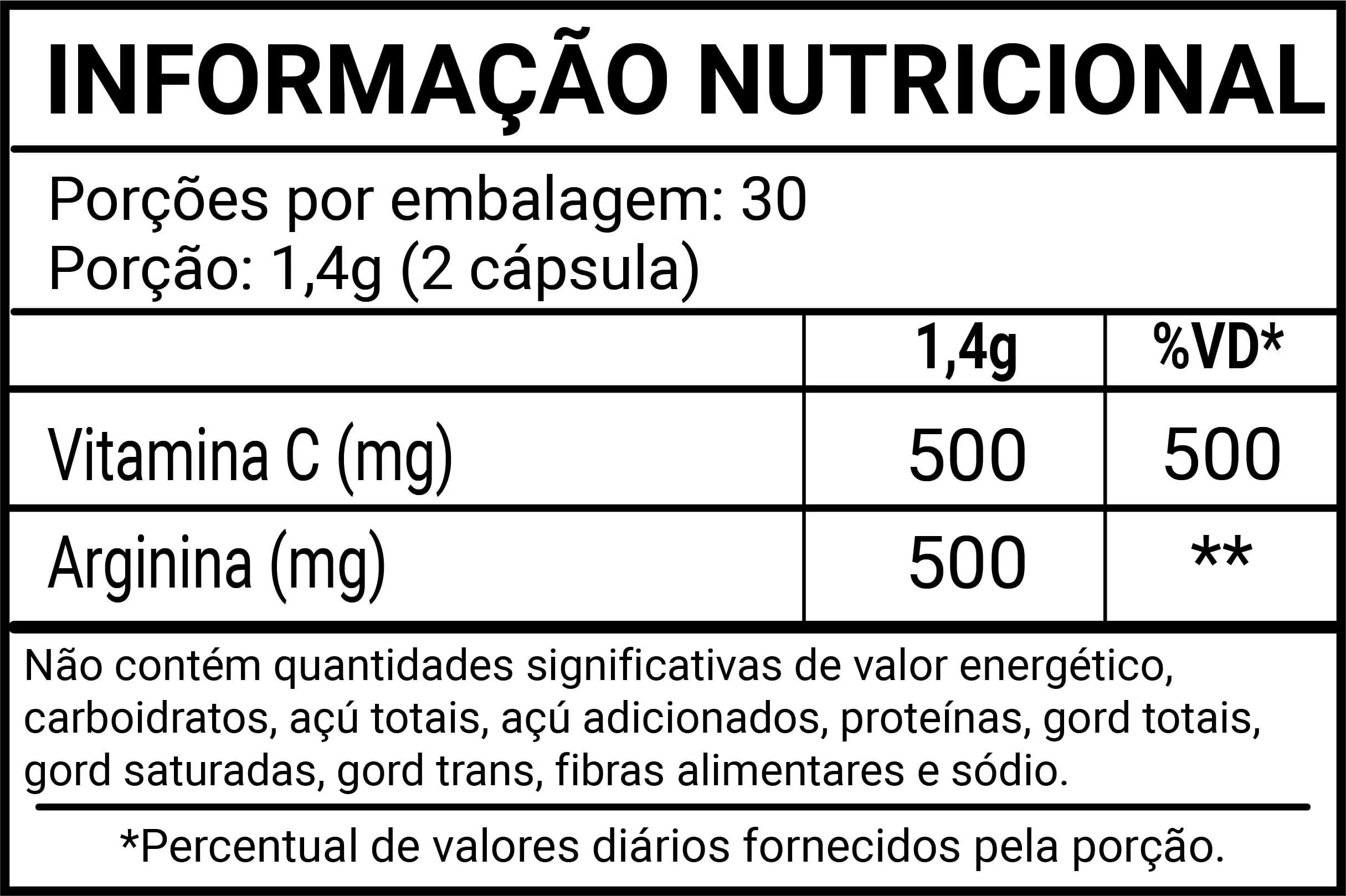 A combinação de L-Arginina e Vitamina C oferece suporte abrangente ao organismo, auxiliando na melhora da performance física, na proteção antioxidante e no fortalecimento do sistema imunológico. As cápsulas são desenvolvidas com a tecnologia CLEAN LABEL, sendo livres de lactose, açúcares adicionados, sódio, alergênicos e glúten.