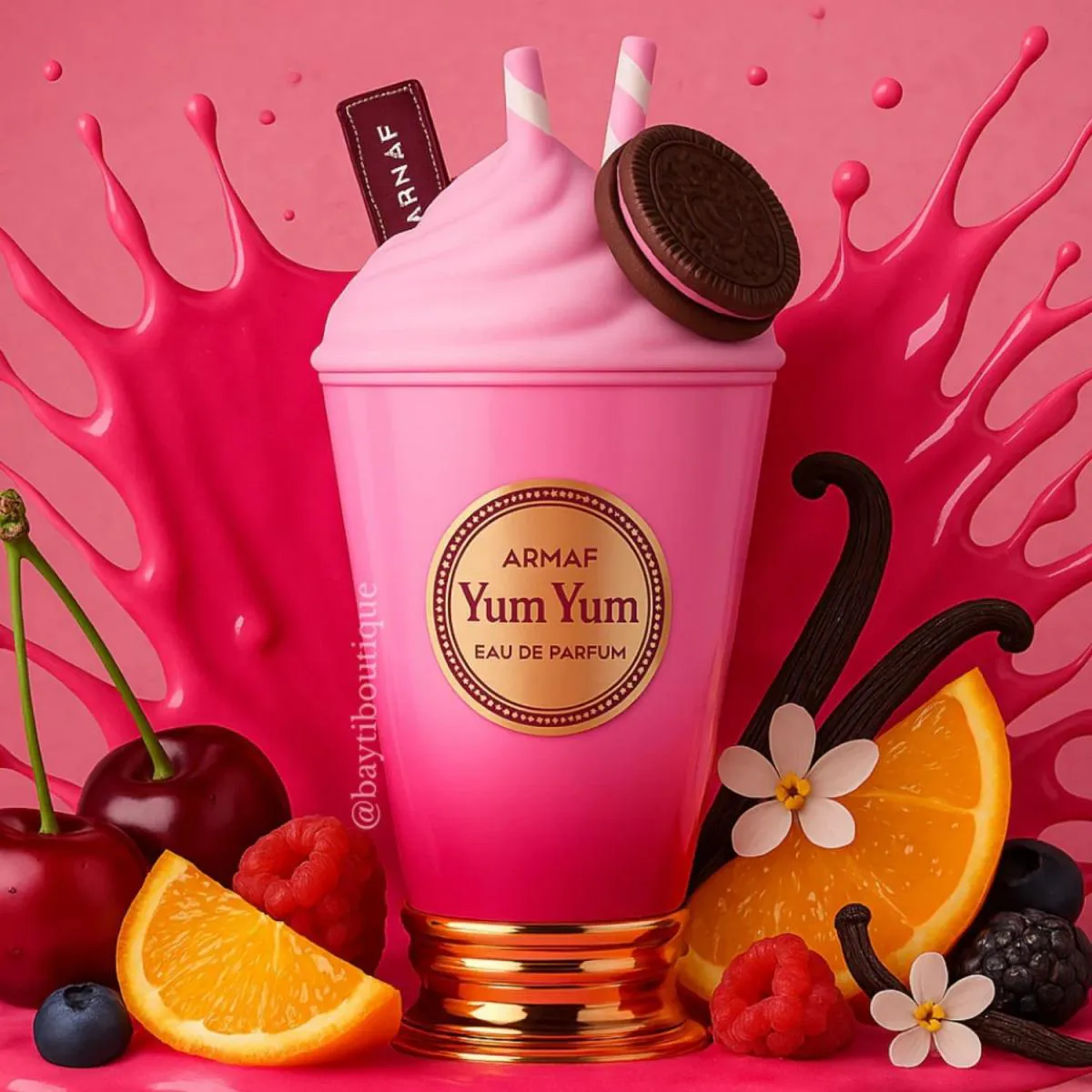 Perfume feminino gourmand frutado. Armaf Yum Yum Delights Eau de Parfum é uma explosão doce, alegre e irresistivelmente envolvente, perfeita para mulheres que adoram fragrâncias marcantes e divertidas. Inspirado em sobremesas deliciosas, o perfume combina notas suculentas de frutas com um fundo cremoso e açucarado, criando uma assinatura olfativa viciante. Ideal para usar em momentos especiais ou quando quiser deixar sua marca com um toque doce e ousado. Pirâmide Olfativa: