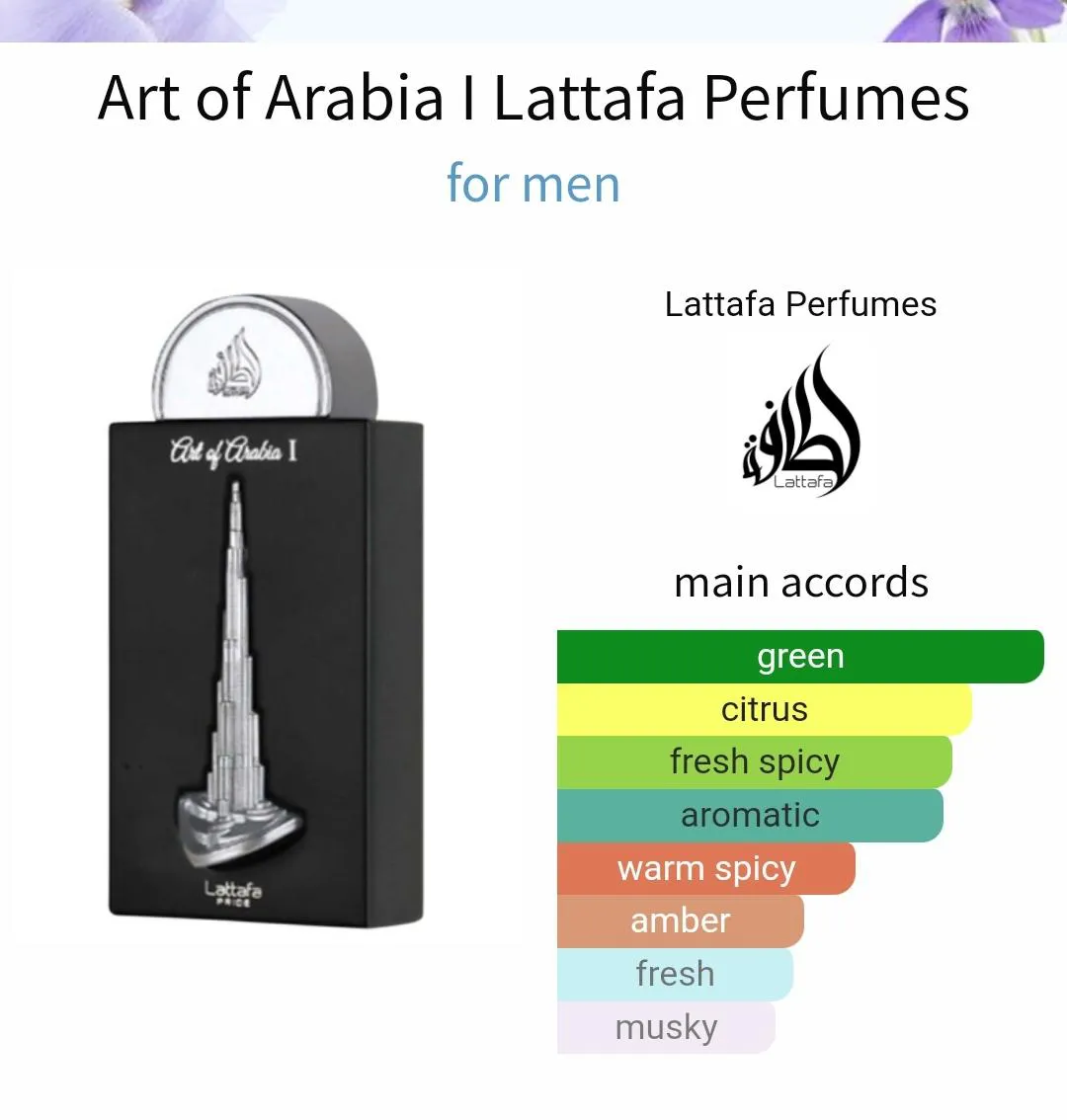 LATTAFA Art of Arabia I de Lattafa perfumes é um perfume Cítrico Aromático Masculino. Esta é uma nova fragrância. Art of Arabia I foi lançada em 2023.O Perfume Art Of Arabia I Lattafa Eau de Parfum Masculino 100ml é uma fragrância luxuosa e envolvente, que traduz a sofisticação e a riqueza das perfumarias do Oriente Médio. Criado para homens que apreciam perfumes intensos e marcantes, este Eau de Parfum combina ingredientes nobres e exóticos, proporcionando uma experiência olfativa única. Sua abertura é impactante, com notas especiadas e cítricas, trazendo um frescor vibrante combinado a um toque picante sofisticado. No coração, a fragrância revela um blend de madeiras preciosas e nuances aromáticas, que conferem profundidade e elegância ao perfume. A base é dominada por notas de oud, âmbar e baunilha, criando um rastro quente e sedutor. O oud, uma madeira altamente valorizada na perfumaria árabe, adiciona um toque de mistério e sofisticação, enquanto o âmbar e a baunilha proporcionam calor e suavidade. O Art Of Arabia I Lattafa é perfeito para homens que buscam uma fragrância intensa e sofisticada, ideal para noites especiais e ocasiões formais. Seu aroma marcante e refinado destaca a personalidade de quem o usa, deixando uma impressão inesquecível. As notas de topo são: Bergamota e Hortelã. As notas de coração são: Chá Preto, Gengibre e Lavanda. As notas de fundo são: Ambroxan, Olíbano e Canela.