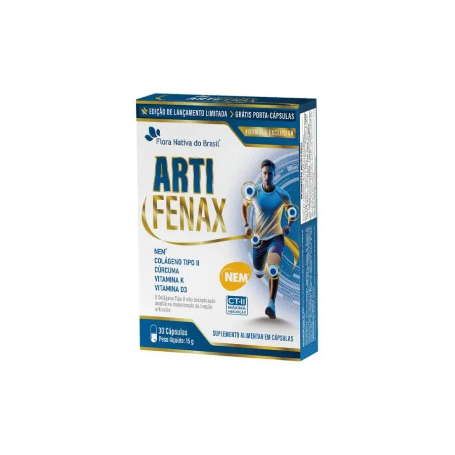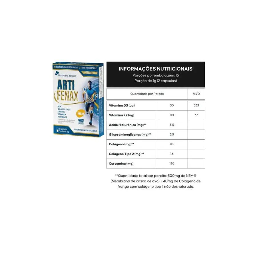 ArtiFenax – Suplemento Alimentar em Cápsulas (30 cápsulas)Flora Nativa do Brasil ArtiFenax é um suplemento alimentar em cápsulas desenvolvido com uma fórmula exclusiva que combina ingredientes como NEM®, colágeno tipo II não desnaturado, cúrcuma, vitamina K e vitamina D3. Ideal para quem busca adicionar ao dia a dia componentes cuidadosamente selecionados para uma rotina mais ativa e equilibrada. Com tecnologia CT-II de máxima absorção, este suplemento é apresentado em edição limitada. Destaques: NEM® (membrana de casca de ovo natural) Colágeno Tipo II não desnaturado Cúrcuma (curcumina) Vitaminas K e D3 30 cápsulas por embalagem Peso líquido: 15g