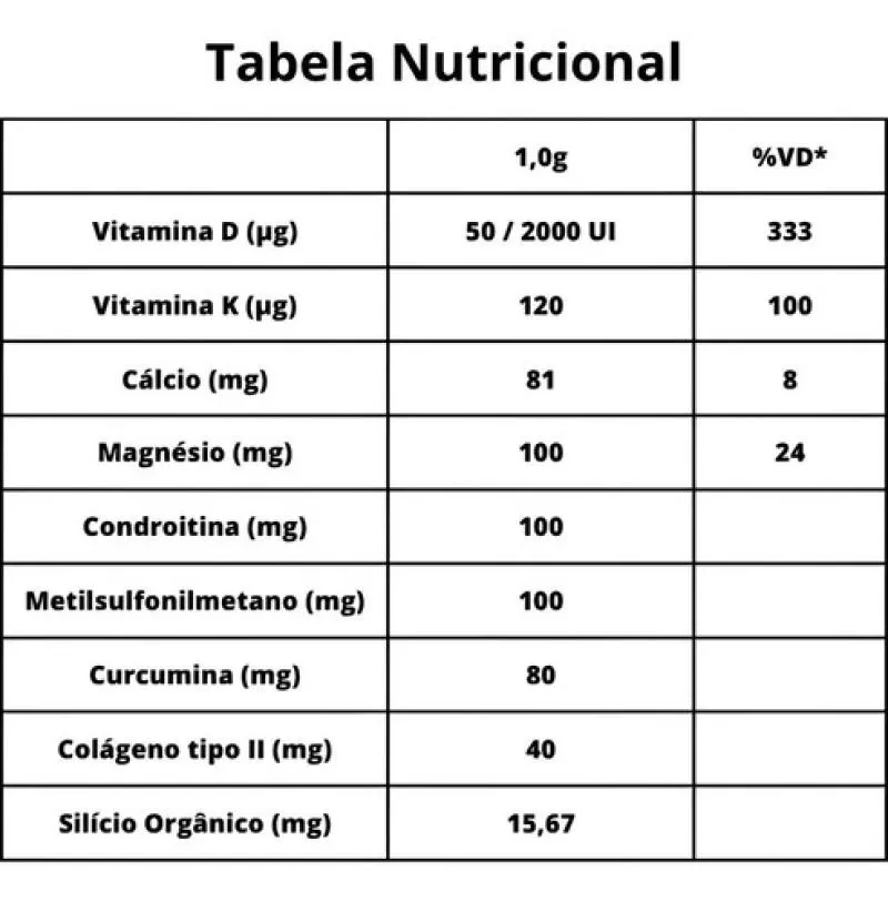 - Contém colágeno tipo II e vitaminas K2 e D3.
