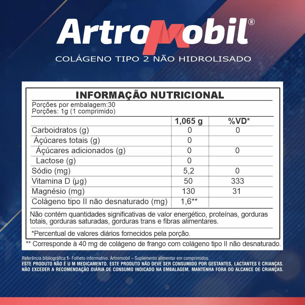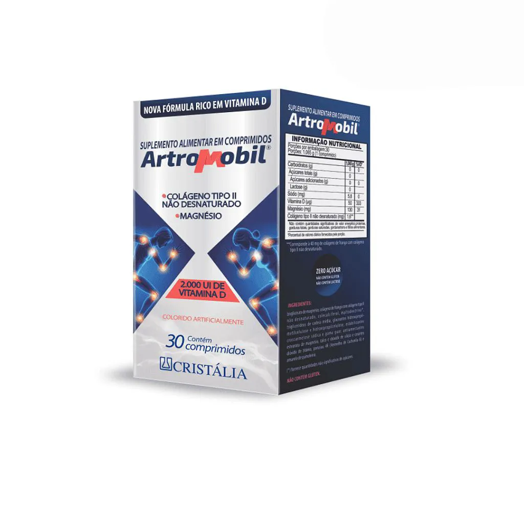 Artromobil é um suplemento alimentar completo, formulado com ingredientes cuidadosamente selecionados para promover o bem-estar das articulações, músculos e ossos. Sua composição avançada une os benefícios do colágeno tipo II, glucosamina, condroitina, MSM (metilsulfonilmetano), vitamina c, vitamina d e magnésio, que atuam de forma sinérgica para restaurar, proteger e fortalecer a estrutura osteoarticular. Ideal para pessoas com dores articulares, rigidez muscular, desgaste das cartilagens ou fragilidade óssea, Artromobil é o aliado ideal para manter a qualidade de vida em todas as fases da vida.Benefícios de Artromobil