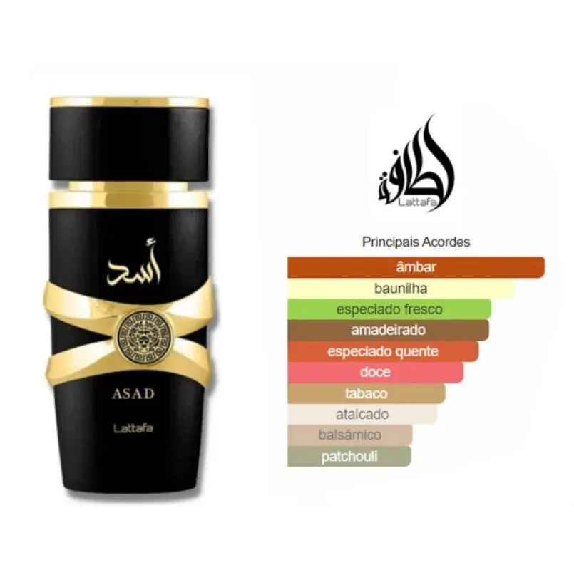 Perfume Lattafa Asad Eau de Parfum 100mlO Lattafa Asad é uma fragrância intensa, misteriosa e poderosa — criada para quem deseja se destacar com elegância e confiança. Combinando o luxo da perfumaria árabe com um toque moderno, Asad (que significa “leão” em árabe) entrega uma assinatura olfativa quente, sensual e extremamente marcante. Logo nas notas de saída, o perfume revela acordes picantes e doces, como canela e baunilha, que despertam os sentidos.
