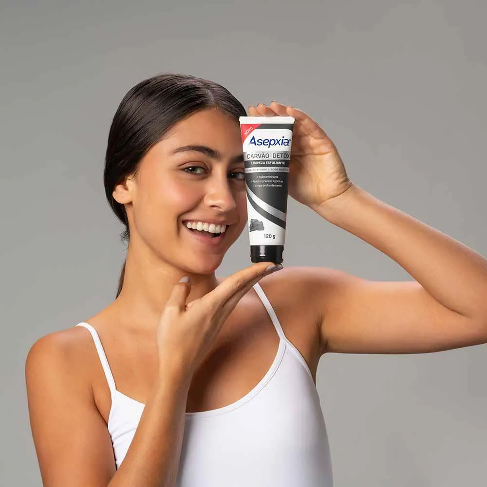 O Asepxia Limpeza Esfoliante Carvão Detox remove e previne cravos e espinhas, limpa profundamente e purifica a pele.