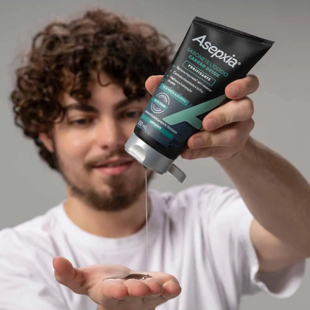 Asepxia Sabonete Líquido Carvão Detox é a limpeza diária hipoalergênica que desobstrui e purifica os poros, deixando a pele hidratada e livre da oleosidade e da poluição. Ideal para a pele mista a oleosa. Sua fórmula é enriquecida com o carvão ativado, um poderoso ingrediente de origem natural, conhecido pelo seu poder de remoção de impurezas e absorção da oleosidade. Além disso, não resseca e melhora a hidratação da pele. Conheça a linha completa Asepxia Carvão Detox.