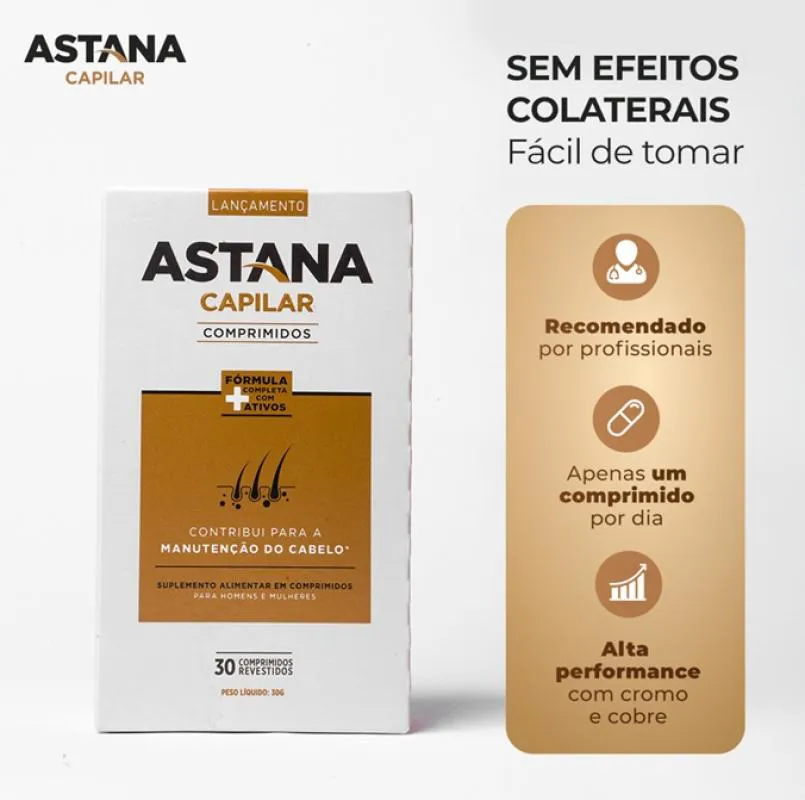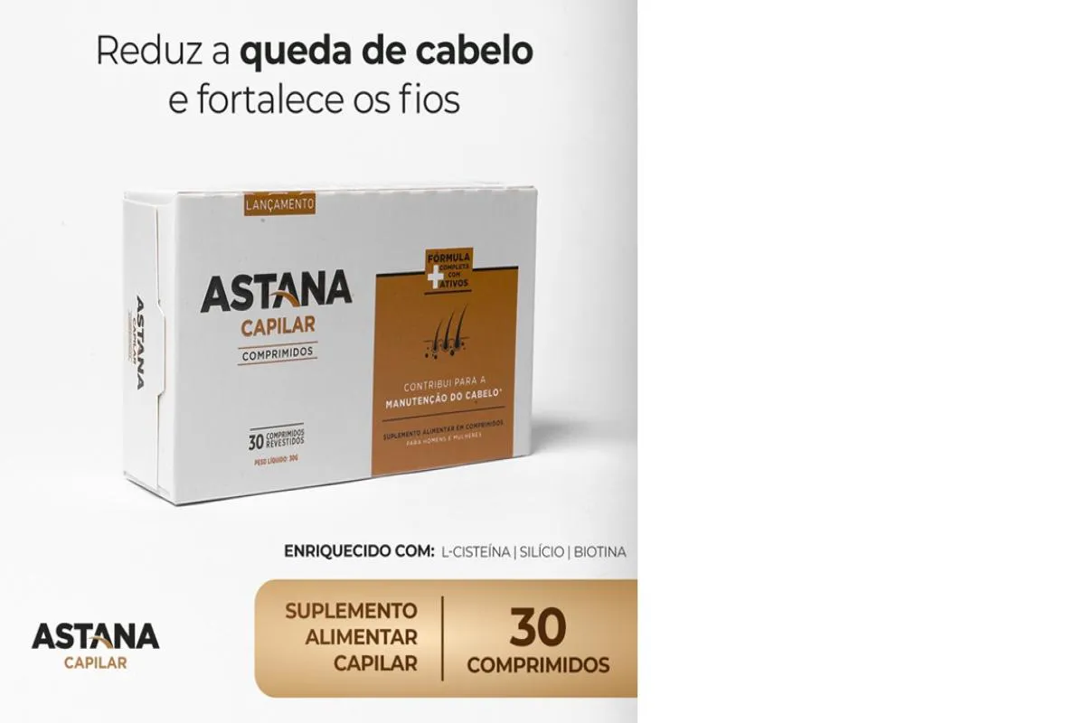 Suplemento para Queda e Crescimento de cabelo Astana Capilar é um suplemento alimentar em comprimidos, desenvolvido para fortalecer os fios, reduzir a queda e estimular o crescimento capilar. Sua fórmula exclusiva combina ativos como cisteína, silício, biotina, zinco, vitamina c e outros nutrientes essenciais que atuam diretamente na raiz dos cabelos, combatendo a quebra e promovendo fios mais fortes, saudáveis e volumosos. Ideal para homens e mulheres, Astana Capilar age de dentro para fora, restaurando a saúde do couro cabeludo e contribuindo para a manutenção e o crescimento dos cabelos.