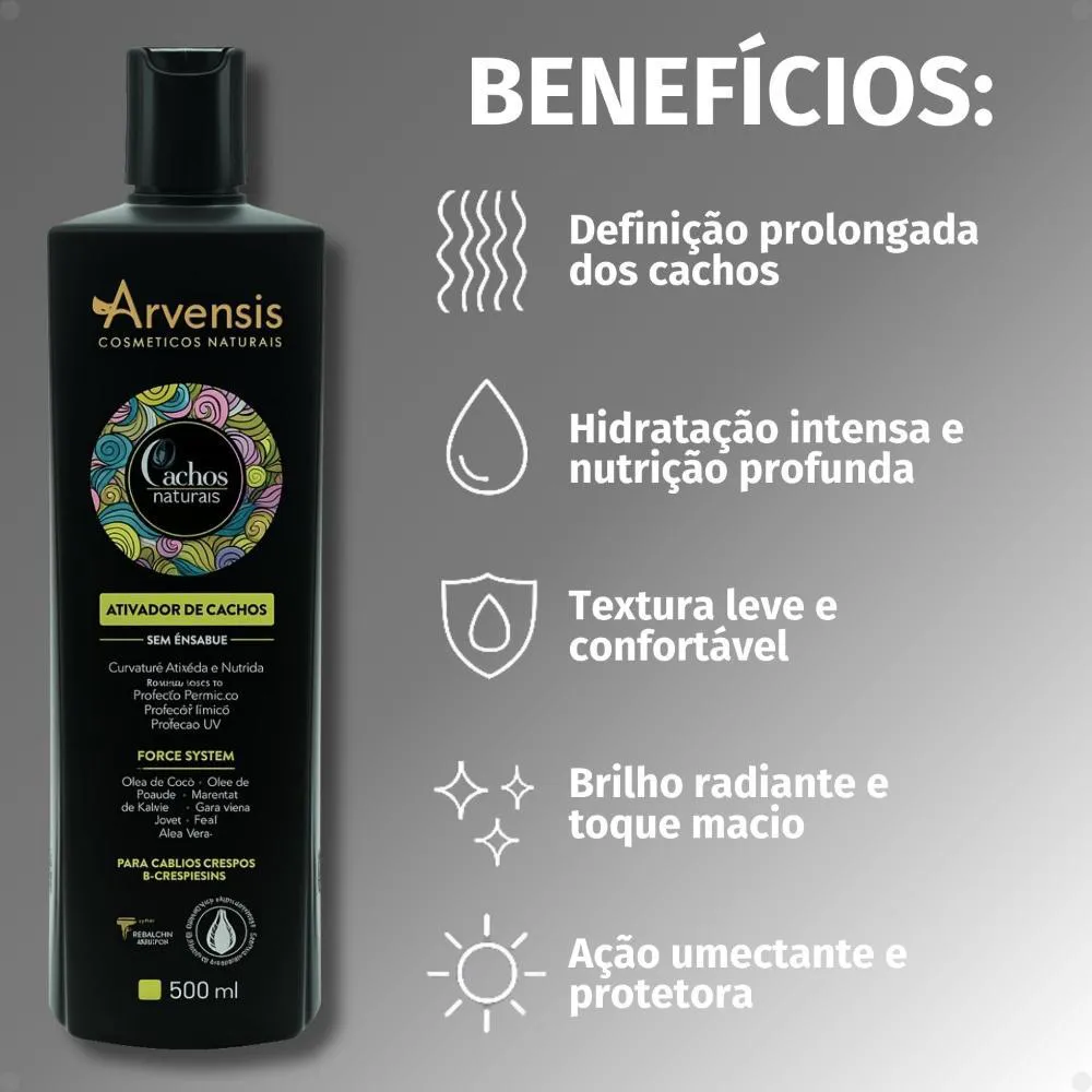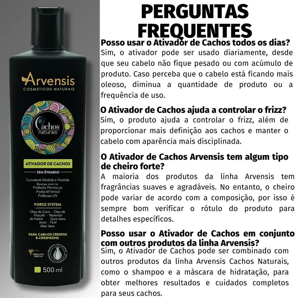 Ativador de Cachos Arvensis Cachos Naturais Cabelos Crespos e Crespíssimos O Ativador de Cachos Arvensis Cachos Naturais (500ml) foi desenvolvido especialmente para cabelos crespos e crespíssimos, proporcionando uma definição impecável e hidratação profunda. Sua fórmula enriquecida com ingredientes nutritivos ajuda a definir os cachos, deixando-os mais soltos, macios e com brilho natural, enquanto controla o frizz ao longo do dia. Com uma textura leve, o ativador oferece uma fixação duradoura, sem pesar nos fios, garantindo cachos bem formados e com movimento. Ele facilita o processo de finalização, mantendo os fios hidratados, nutridos e com aparência saudável. Ideal para o uso diário, o Ativador de Cachos Arvensis deixa seus cachos mais definidos, com toque suave e uma sensação de frescor, proporcionando cachos mais lindos e radiantes. Perfeito para quem busca cachos definidos, hidratados e com controle de frizz durante todo o dia. Cachos definidos e hidratados, ação umectante, proteção contra danos, maior elasticidade, controle de frizz e brilho extra. . -Dermatologicamente testado. -Óleo de Coco -Abacate -colágeno Vegetal -vitamina e -Filtro Solar -100% vegano . Modo de usar: Com os cabelos limpos, secos ou úmidos, aplique uma quantidade do Ativador Cachos Naturais na palma das mãos e espalhe do comprimento às pontas, enluvando mecha a mecha. Não enxaguar. O uso completo da linha Cachos Naturais favorece os resultados. Precauções: Somente para uso externo. Manter fora do alcance de crianças. Caso occorer alguma irritação, suspender o uso. Manter em local fresco e longe da iluminação solar. . Perguntas Frequentes A fórmula do Ativador de Cachos pesa nos fios? Não, a fórmula é leve e de rápida absorção, proporcionando definição sem deixar os fios pesados ou rígidos. Com que frequência posso usar o Ativador de Cachos? O ativador pode ser usado diariamente ou sempre que desejar definir os cachos, sem danificar os fios. Qual é o resultado esperado após o uso do Ativador de Cachos? O uso do ativador resulta em cachos mais definidos, hidratados, macios e com brilho natural, sem frizz. Posso usar o Ativador de Cachos em cabelos que estão em transição capilar? Sim, é uma ótima opção para quem está fazendo transição capilar, pois ajuda a definir e hidratar os cachos enquanto cuida da textura do cabelo. . Código de Registro Sanitário (ANVISA) 25351.433415/2016-93