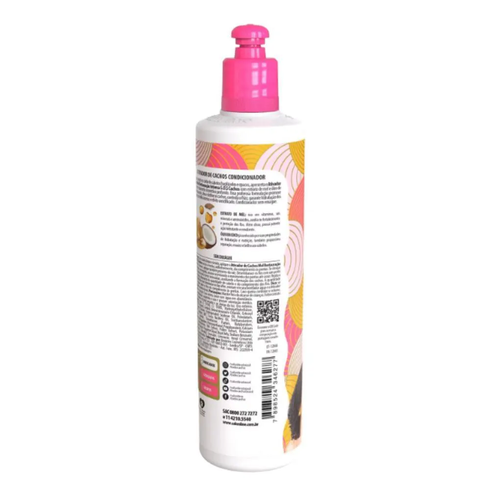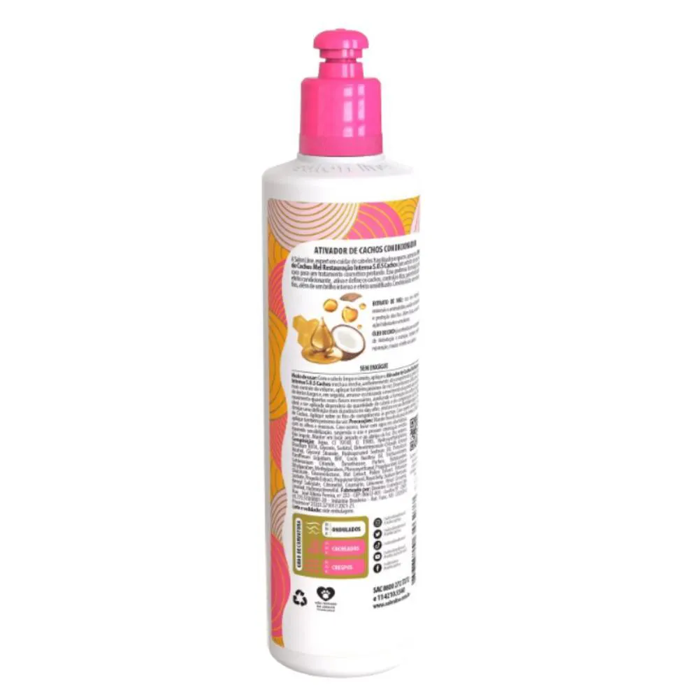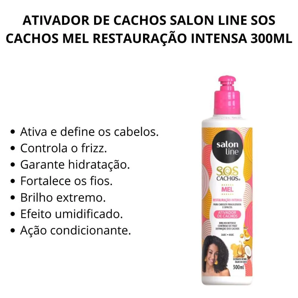Ativador de Cachos Mel O Ativador de Cachos Mel Cachos Intensos S.O.S Cachos conta com ativos que ativam e definem os cabelos cacheados e cabelos crespos, controlam o frizz, garantem hidratação e fortalecimento dos fios, além de brilho extremo e efeito umidificado. condicionador sem enxágue. Ação condicionante. . Principais Ativos Mel: rico em vitaminas, sais minerais e aminoácidos, o mel no cabelo garante força, hidratação e nutrição. Possui ação antioxidante e protege os fios. Além disso, auxilia para um couro cabeludo saudável. Óleo de coco: rico em vitaminas para o cabelo e ácidos graxos, hidrata e nutre, fortalece os fios e proporciona cabelo brilhoso e maciez. . Modo de Uso Com o cabelo limpo e úmido, aplique o Ativador de Cachos Salon Line mecha a mecha, uniformemente, do comprimento às pontas. Se desejar mais controle do volume, aplique também próximo a raiz. Desembarace os fios com um pente de dentes largos e, em seguida, amasse-os iniciando o movimento das pontas até a raiz. Repita o movimento quantas vezes forem necessárias. A quantidade ideal a ser aplicada dependerá da quantidade de cabelo e do comprimento dos fios.