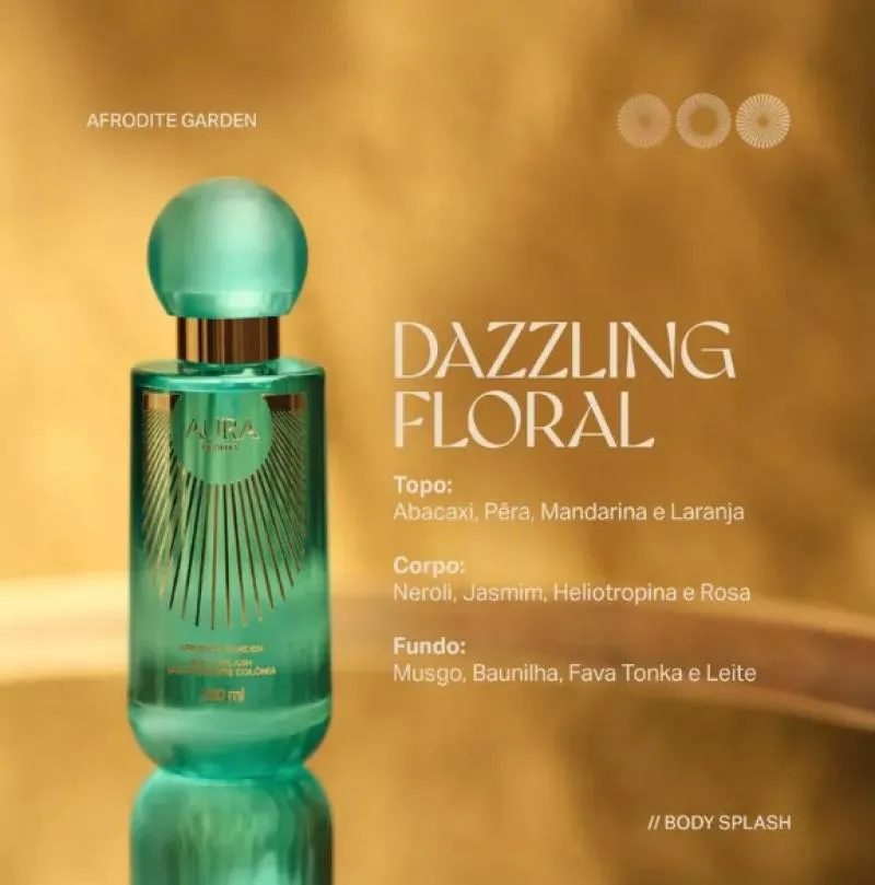 Aura Beauty Afrodite Garden - Body Splash Desodorante Colônia 200ml Inspirada na própria deusa Afrodite, deixe-se envolver por essa aura mística. Com uma fragrância encantadora, repleta de sensualidade e delicadeza, Aura Beauty Afrodite Garden traz suavidade e frescor. Com notas de laranjeira e jasmim, é o elixir floral perfeito para revelar sua deusa interior. Aplique no corpo sempre que desejar.