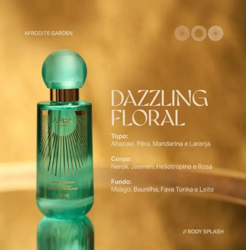 Aura Beauty Afrodite Garden - Body Splash Desodorante Colônia 200ml Inspirada na própria deusa Afrodite, deixe-se envolver por essa aura mística. Com uma fragrância encantadora, repleta de sensualidade e delicadeza, Aura Beauty Afrodite Garden traz suavidade e frescor. Com notas de laranjeira e jasmim, é o elixir floral perfeito para revelar sua deusa interior.
