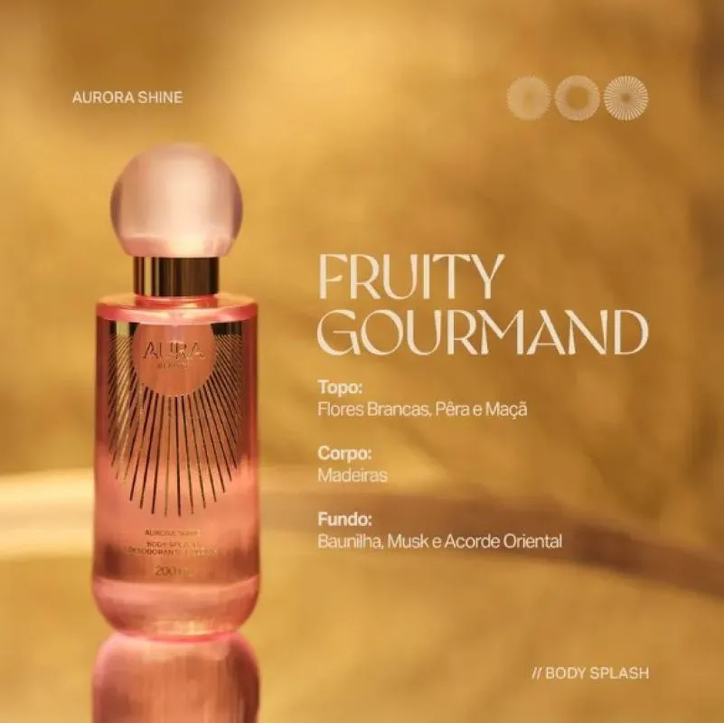 Aura Beauty Aurora Shine - Body Splash Desodorante Colônia 200ml Deixe a sua marca por onde passa, com essa fragrância enigmática, irresistível e cativante. Com uma fórmula delicada, proporciona frescor, toque suave à pele e um brilho sútil. Abre com notas de topo de flores brancas, pêra e maçã, evoluindo para um coração amadeirado e por fim, com notas de fundo de baunilha, musk e acordes orientais. Essa fragrância envolvente te transportará diretamente ao Olimpo.
