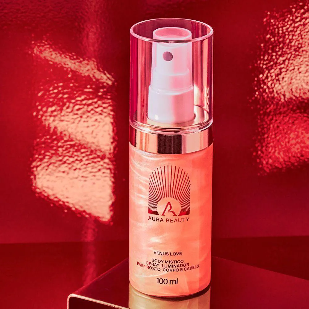 O Aura Beauty Body Místico Venus Love Spray Iluminador 100ml é um produto multifuncional lançado em 2025, criado pela influenciadora Jade Picon para a linha Aura Beauty. Inspirado na deusa do amor, este spray iluminador combina fragrância gourmand, hidratação e um efeito glow radiante para rosto, corpo e cabelo. Desenvolvido para mulheres que celebram a autoconfiança e desejam brilhar, sua fórmula vegana e biodegradável, enriquecida com oligoelementos (sais de sódio, magnésio, zinco e manganês), nutre a pele, texturiza os cabelos e pode ser usado como primer ou fixador de maquiagem. Com notas doces de chocolate branco, caramelo, avelã, baunilha e fava tonka, oferece uma aura envolvente e sedutora, transformando cada aplicação em um momento de glamour e autoestima.