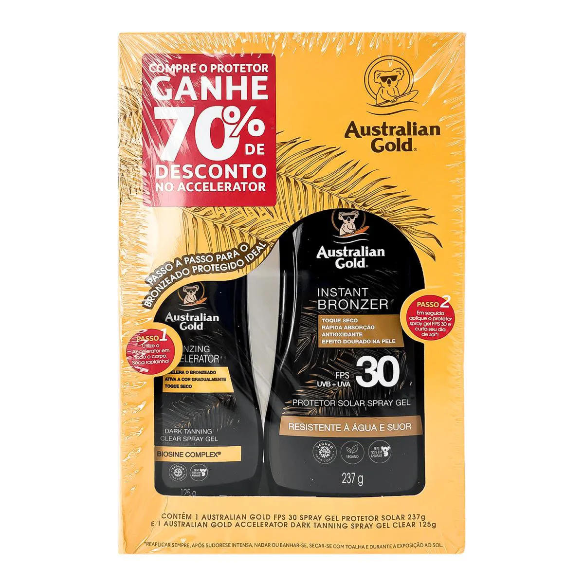 Contém:Australian Gold FPS 30 - Protetor Solar em Spray 237ml: protege a pele dos raios UVA e UVB e confere um bronzeado luminoso. Deixa o corpo com cor bronzeada instantaneamente e resiste à água por até 80 minutos. Possui calmantes que proporcionam toque macio. A fórmula não é testada em animais e não possui PABA, glúten, álcool e tintas.