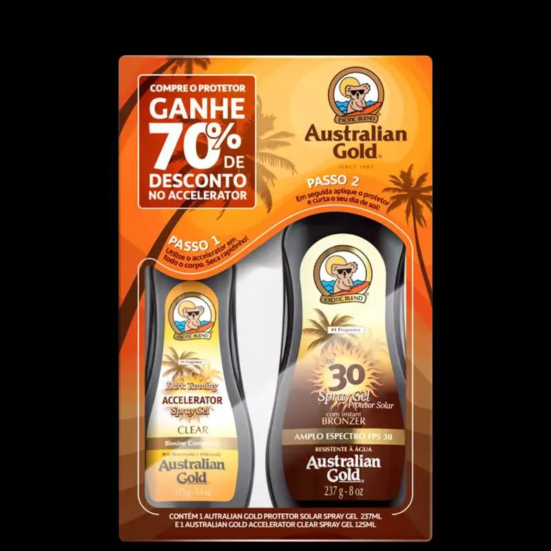 Kit com protetor solar spray e bronzeador para todos os tipos de pele. Kit Australian Gold Instant Bronzer protege do sol com brilho dourado. Ideal para quem quer se bronzear com segurança.