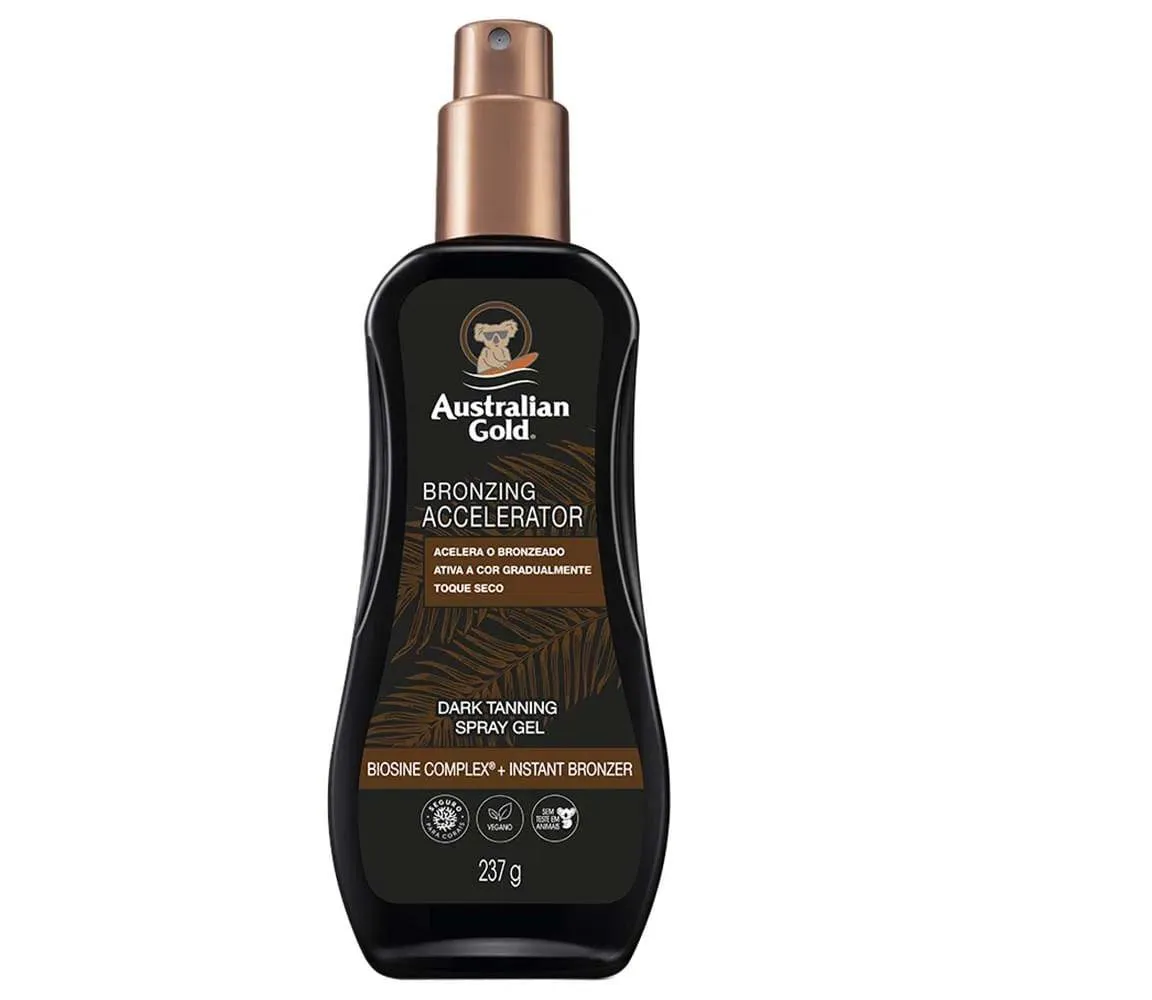 Australian Gold Accelerator Dark Tanning Spray com Instant Bronzer respeita sua genética natural, evitando o bronzeado artificial.