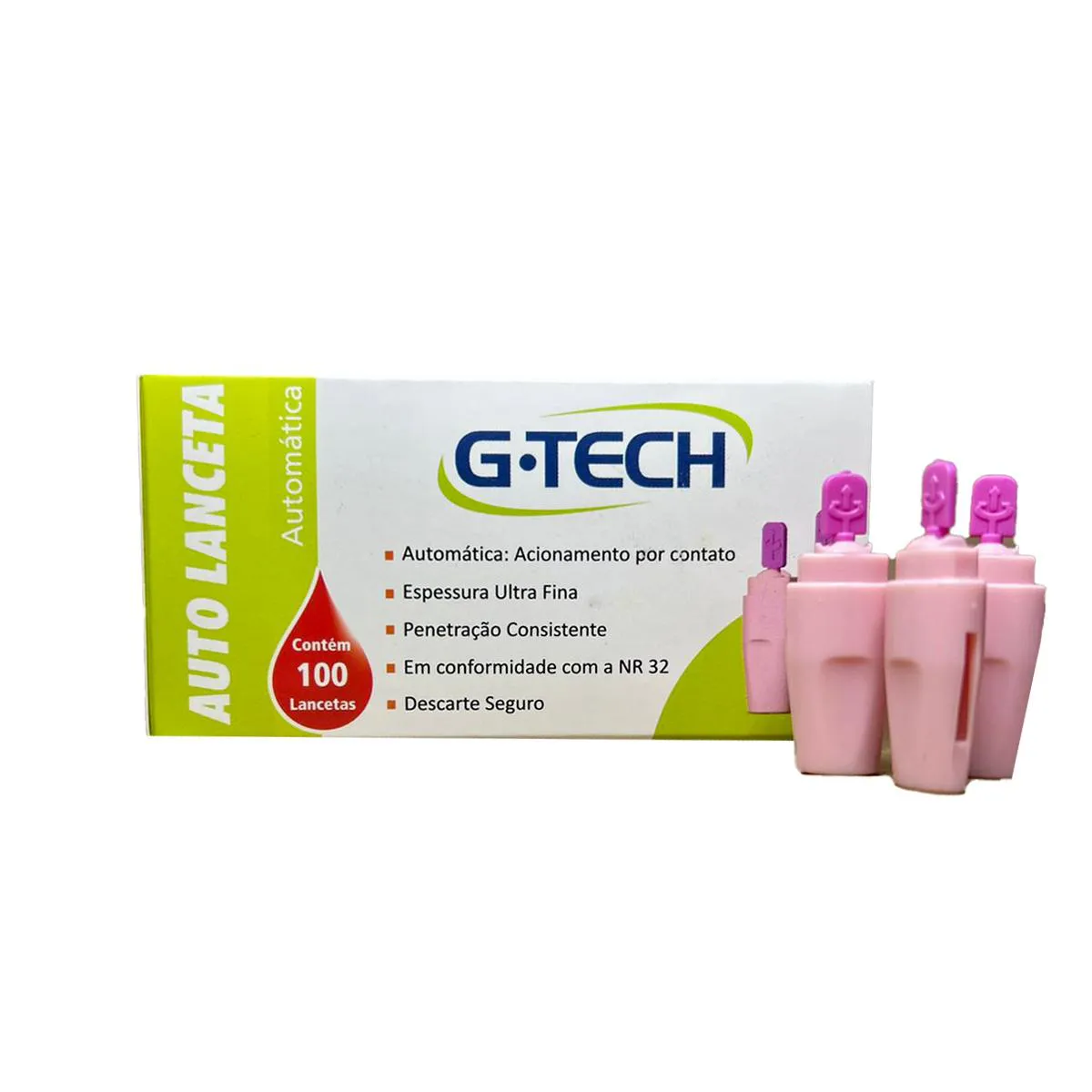 Auto Lanceta Automática G-Tech 28G Com100 Unidades Ultrafina Rosa