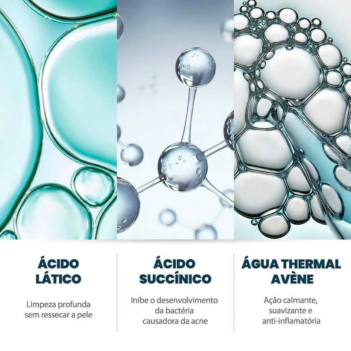 - Contém Ácido Lático (2 %) e Ácido Succínico, promovendo limpeza esfoliante leve, ação antibacteriana e controle prolongado da oleosidade.