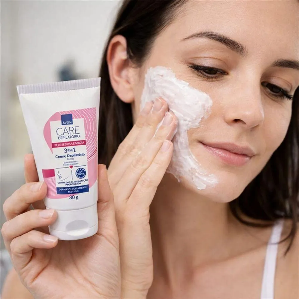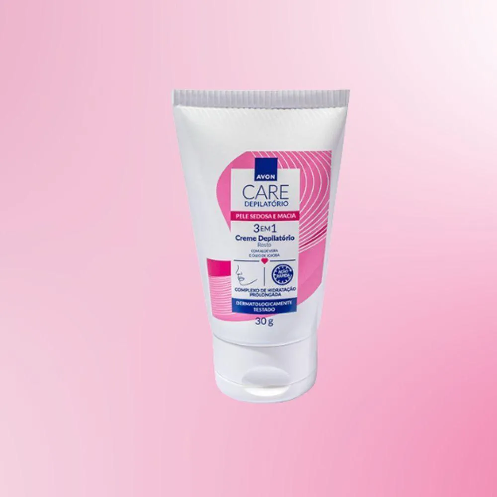 Avon Care Nova fórmula para depilação.O Creme Depilatório Avon Care, desenvolvido por especialistas em pele, apresenta uma fórmula com fragrância exclusiva, que remove os pelos cuidadosamente.Contém nosso Complexo de Hidratação Prolongada, combinando ingredientes específicos que ajudam a manter a hidratação natural da pele.FÓRMULA 3 EM 1. Remove os pelos de maneira rápida e eficaz.. Prolonga o efeito da depilação por 1 semana.. Pele com sensação macia e hidratada imediatamente após o usoModo de usoIndicado para o buço. Utilizando as mãos, espalhe o creme em camadas suficientemente espessas de forma a cobrir completamente os pelos. Não esfregue. Deixe o creme agir por 5 minutos. Retire o creme de uma pequena área. Se os pelos não saírem com facilidade, deixe o creme agir por mais tempo. NÃO ULTRAPASSE 10 MINUTOS NO TEMPO TOTAL DE APLICAÇÃO. Não reaplique em menos de 24 horas no mesmo local. Remova o creme com ajuda de uma toalha molhada. Enxágue com água morna. Não esfregue e não use sabonete. Após o uso, é recomendado aguardar 24 horas antes de tomar sol e aplicar ácidos, retinol ou esfoliantes faciais.Teste de sensibilidadeAntes de usar o creme depilatório corporal, é importante realizar o teste de sensibilidade em uma pequena área da região a ser depilada, aplicando de acordo com o modo de uso. Se após 24 horas não houver nenhuma ocorrência adversa, você poderá realizar uma depilação com segurança. Caso tenha sensação de ardor ou pinicação, remova o produto imediatamente e enxágue abundantemente a pele com água. Se a sensação persistir, consulte um médico. Não utilize sobre a pele irritada ou lesionada.IngredientesÁgua, ÓLEO mineral, ÁLCOOL CETEARÍLICO, TIOGLICOLATO DE POTÁSSIO, CETEARETE 20, GLICEROL, ESTEARATO DE GLICERILA AUTOEMULSIONANTE, ÁLCOOL ESTEARÍLICO, ESTEARETE 21, ÉTER POLIPROPILENOGLICOL MONOESTEARÍLICO, HIDRÓXIDO DE CÁLCIO, ESTEARETE 20, SILICATO DE LÍTIO MAGNÉSIO E SÓDIO, EDETATO TETRASSÓDICO, LINALOL, EXTRATO DE ALOE VERA, FOSFATO DISSÓDICO, HIDRÓXIDO DE POTÁSSIO, CITRAL, MANTEIGA DE KARITÉ, ÓLEO DA SEMENTE DE JOJOBA, ACETATO DE TOCOFERILA E TOCOFEROL.