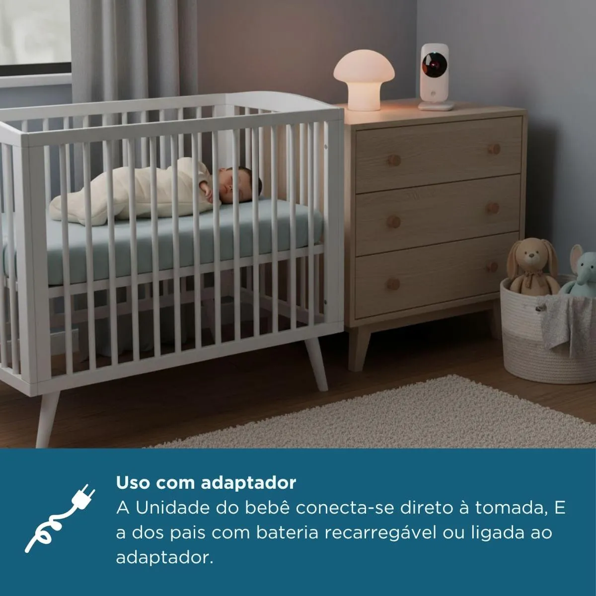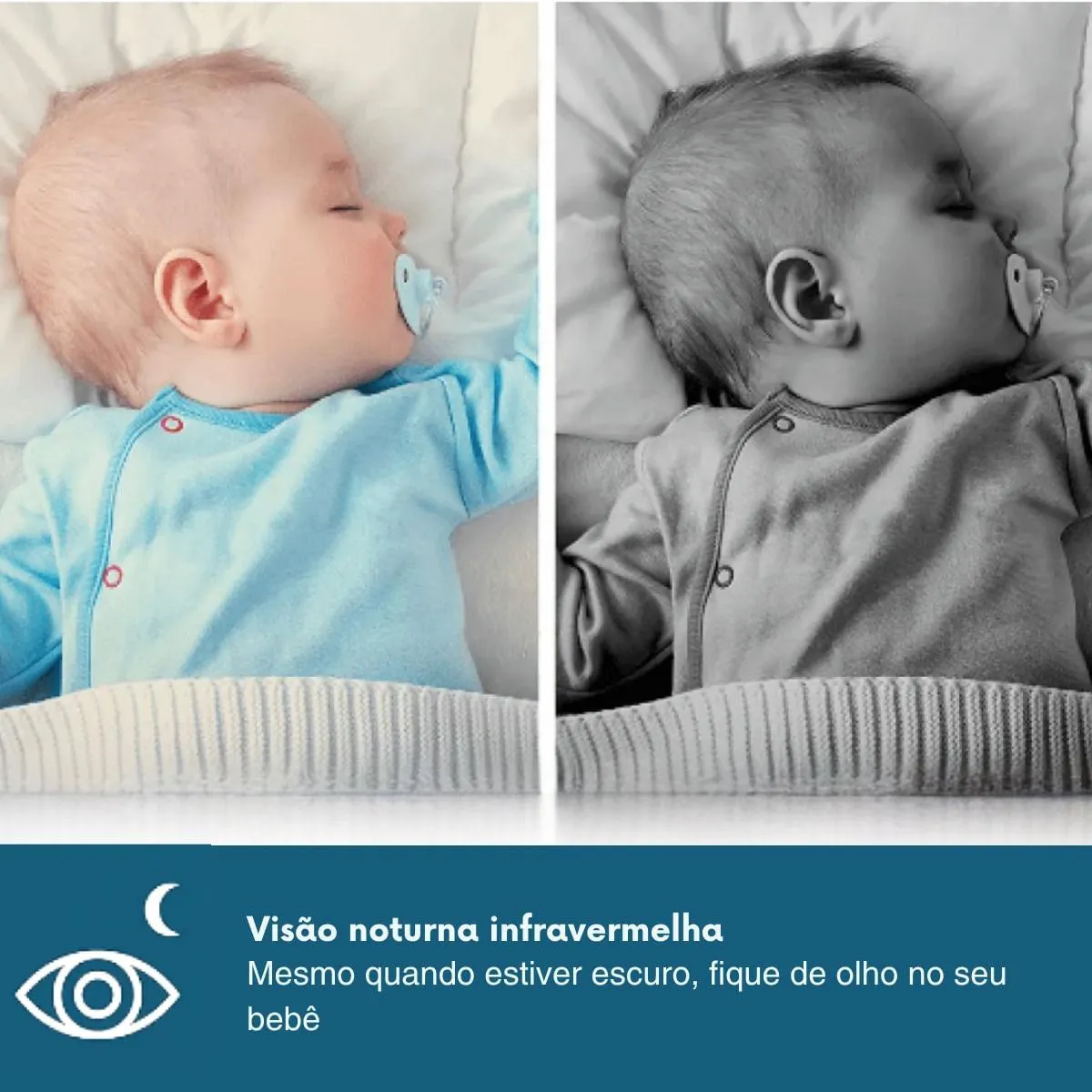- Visão noturna infravermelha que permite acompanhar o bebê mesmo em ambientes com pouca luminosidade.