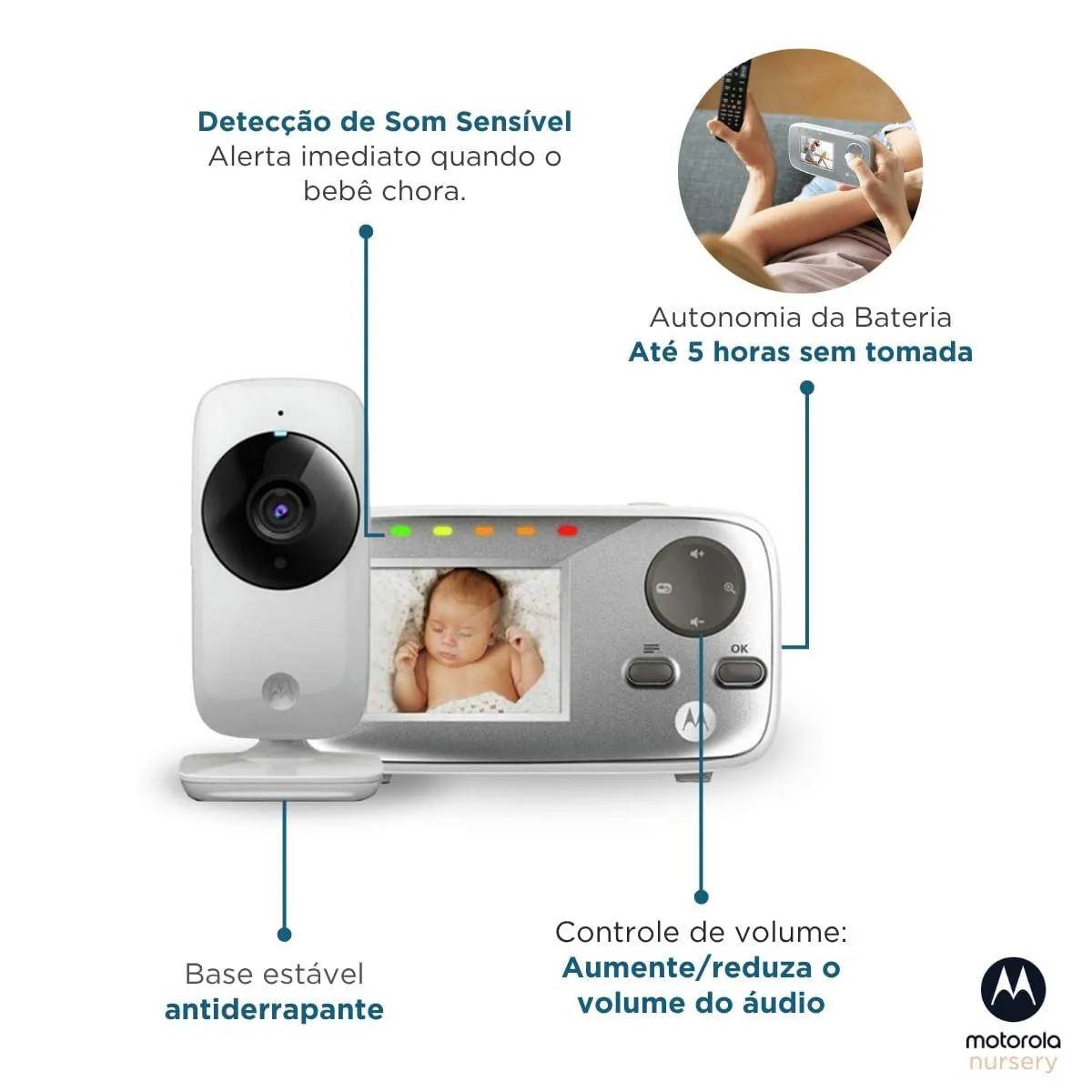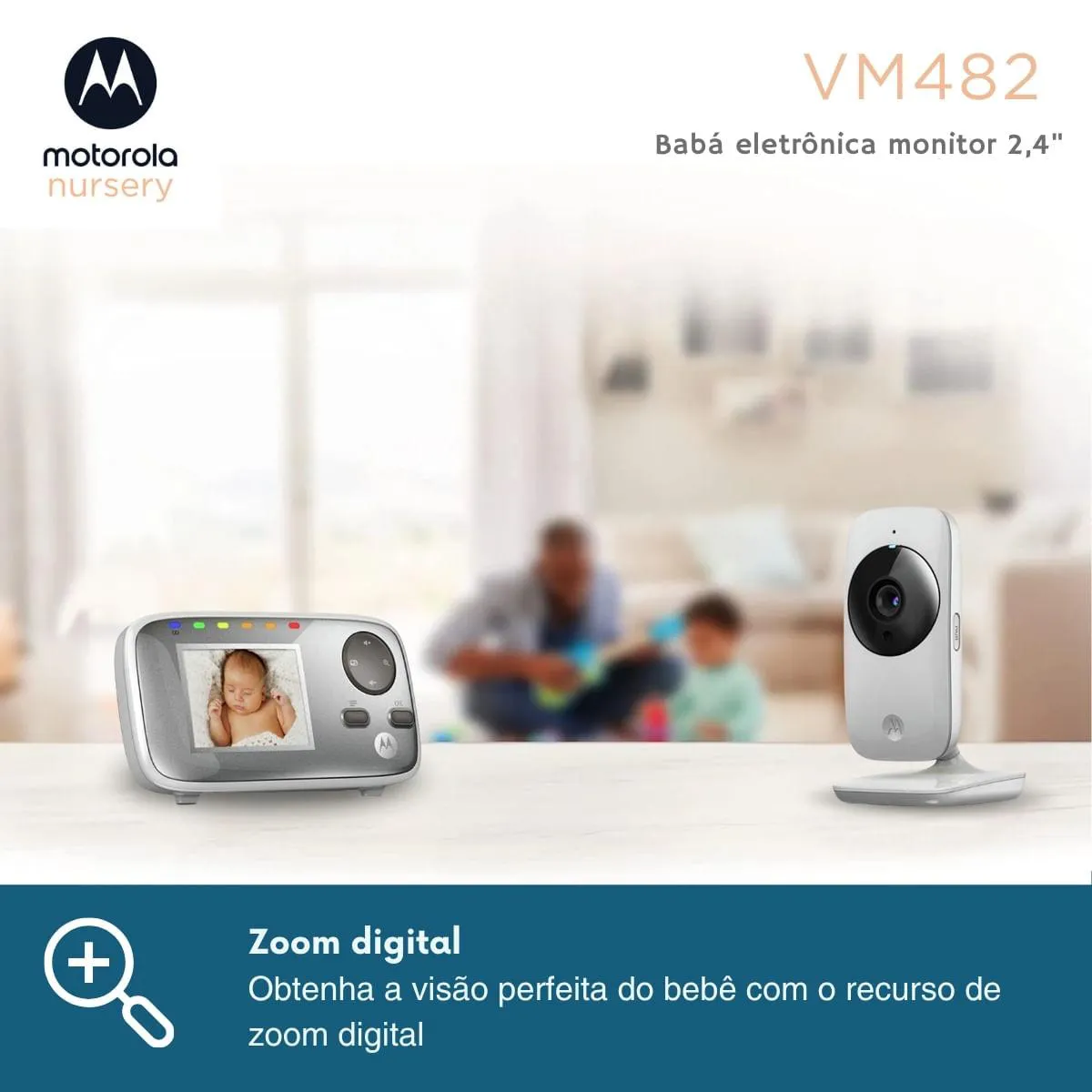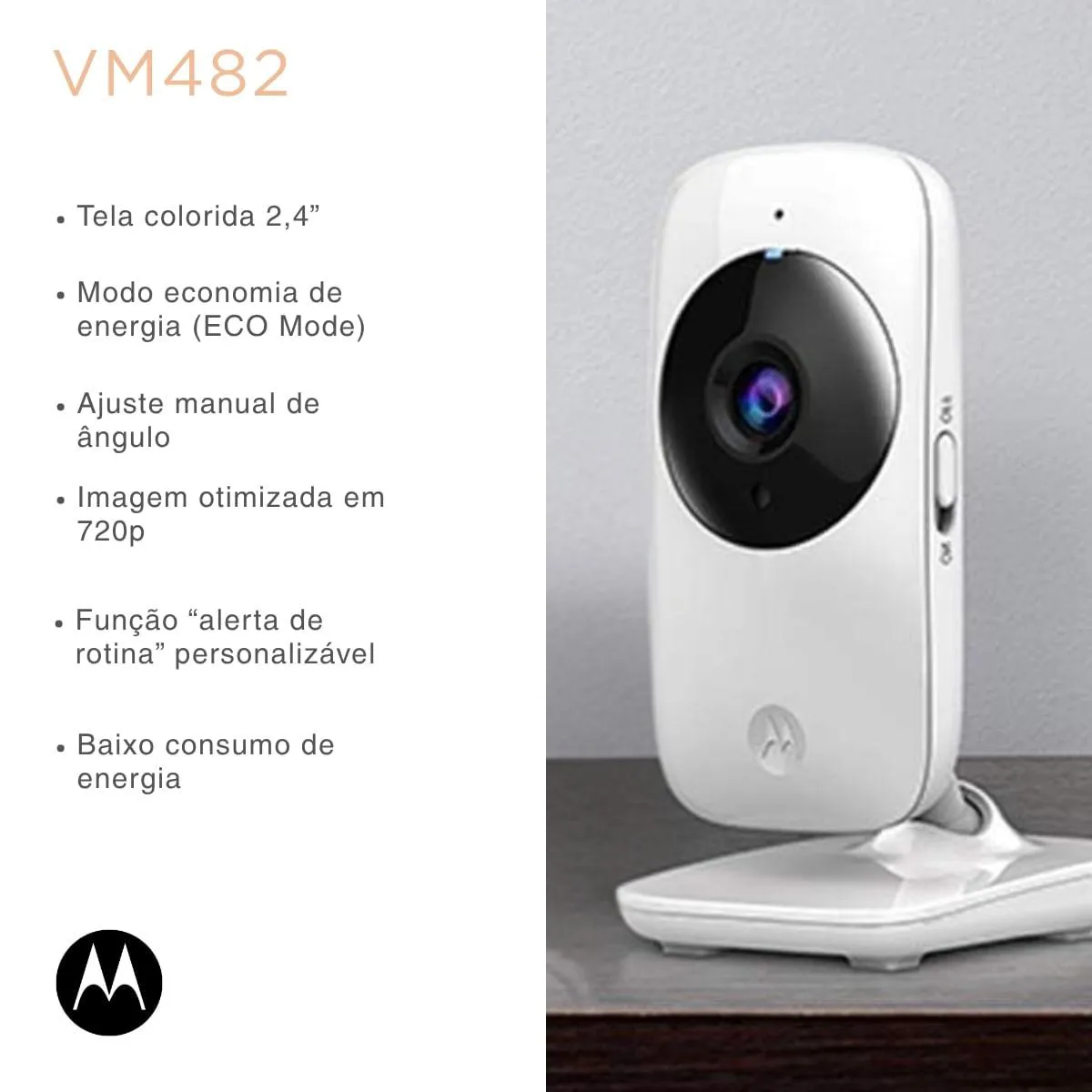 A Babá Eletrônica Motorola VM482 é um dispositivo eletrônico de monitoramento projetado para acompanhar bebês, com tela colorida de 2,4 polegadas, câmera com visão noturna e recursos de áudio e temperatura. Possui design moderno na cor branca, com tecnologia de conexão segura e privada.