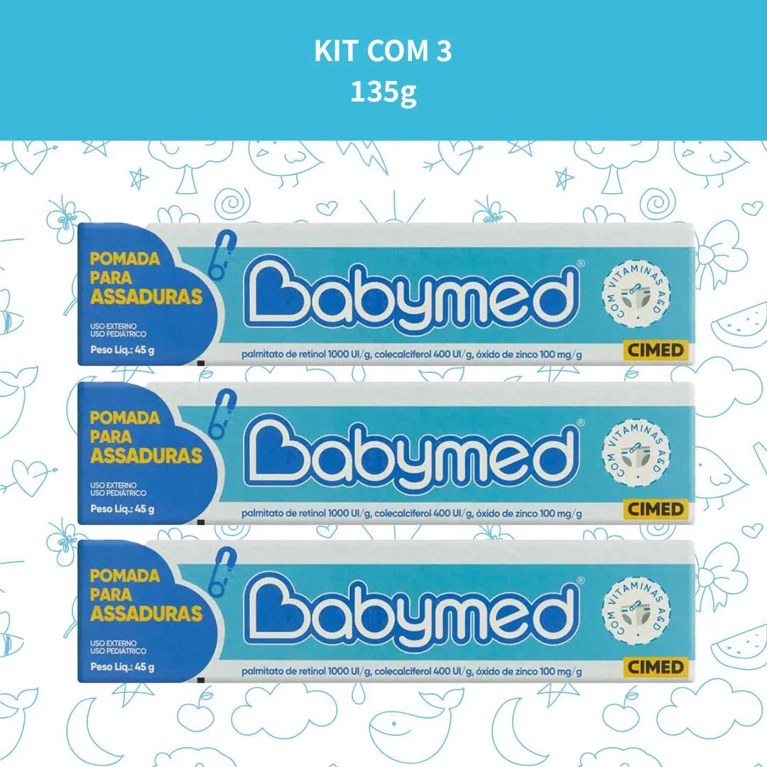 Babymed Azul Pomada Assaduras 100mg Kit 3 - 45g - Cimed A Babymed Rosa da Cimed é uma pomada desenvolvida para o cuidado diário da pele delicada dos bebês, especialmente nas áreas em contato com fraldas. Sua fórmula contém palmitato de retinol (vitamina A), colecalciferol (vitamina d) e óxido de zinco (100 mg/g ou 150 mg/g conforme a formulação), componentes que ajudam na manutenção da pele protegida e confortável. Com textura cremosa, fácil de aplicar e espalhar, forma uma camada protetora sobre a pele, reduzindo o contato direto com agentes irritantes presentes na urina e nas fezes. Ideal para uso diário após a limpeza da pele na troca de fraldas. Características técnicas: - Contém palmitato de retinol (Vitamina A) + colecalciferol (Vitamina D) + óxido de zinco. - Apresentação: bisnaga com 45 g. - Textura cremosa, fácil de aplicar, adequada para uso infantil. - Desenvolvida para formar barreira protetora na pele em contato com fraldas ou umidade. - Uso externo Modo de uso: Limpe e seque bem a pele da área da fralda. Aplique uma camada fina da pomada Babymed Rosa nas áreas indicadas, uniformemente, a cada troca de fralda ou sempre que necessário. SOBRE A LOJA: Somos a rede de farmácias mais antiga de São José dos Pinhais, atuando no ramo farmacêutico desde 1990 com comprometimento à qualidade e satisfação do cliente. É um prazer compartilhar os nossos valores e as nossas conquistas com quem confia no nosso trabalho! Imagens dos Produtos são Meramente Ilustrativas. Todas as Informações Divulgadas são de Responsabilidade Exclusiva do Fabricante/fornecedor.