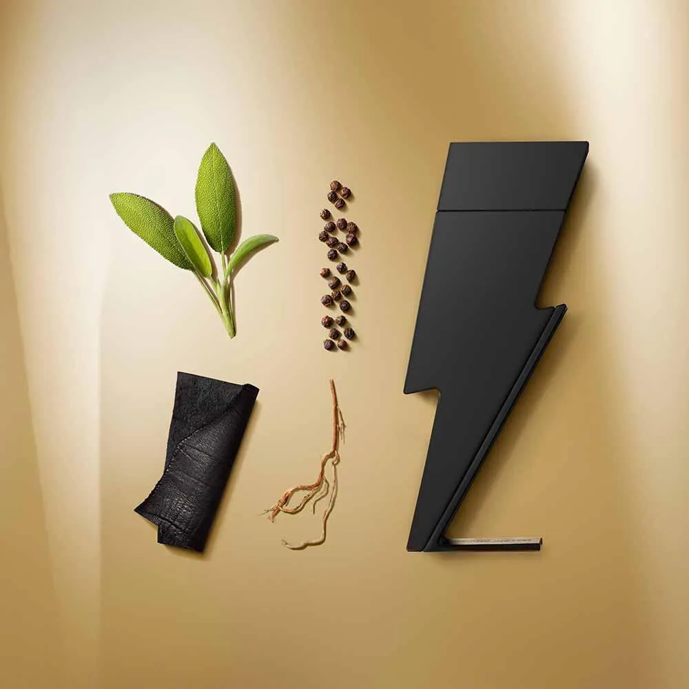 - Notas de cânhamo, couro e vetiver amadeirado.