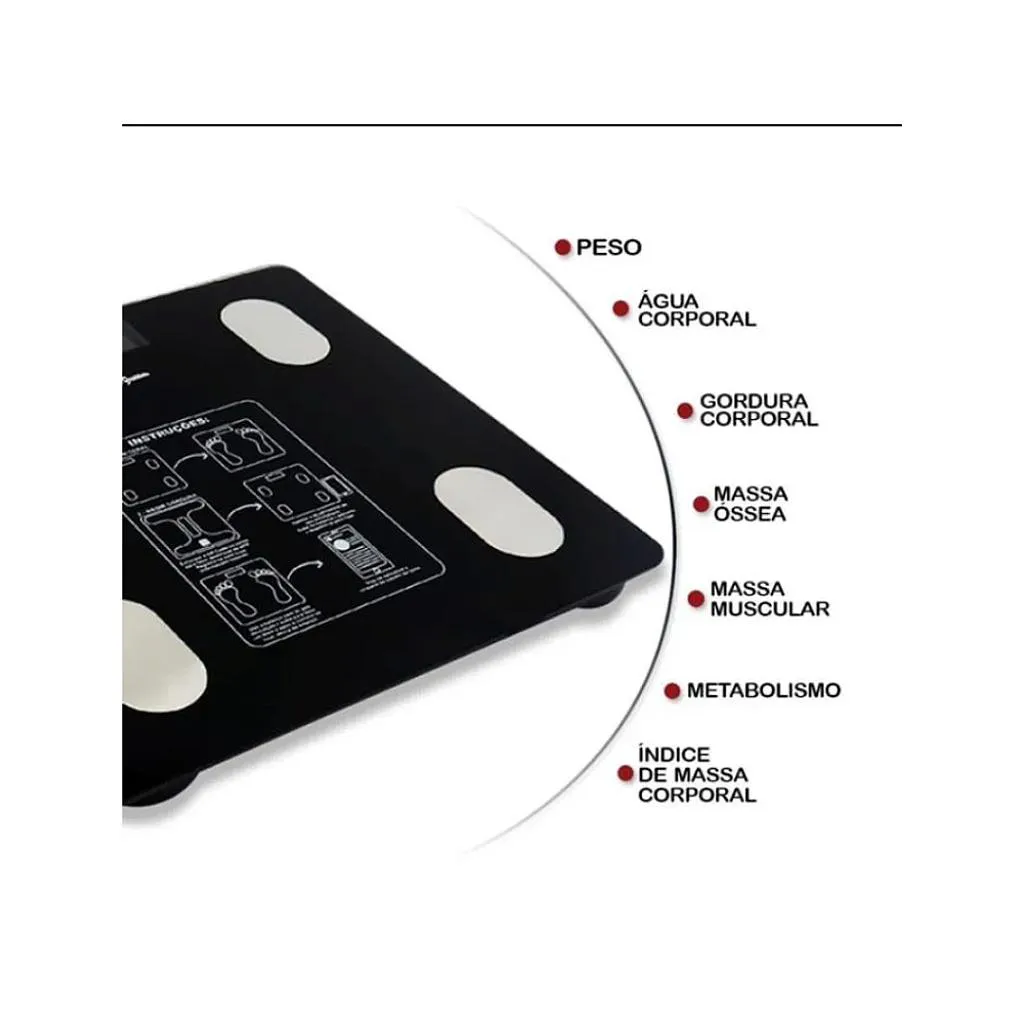 Além do peso corporal, realiza medições de gordura corporal, água corporal, massa muscular, massa óssea e taxa metabólica basal (TMB) — fornecendo uma visão ampla da composição corporal. - Design Moderno e Funcional