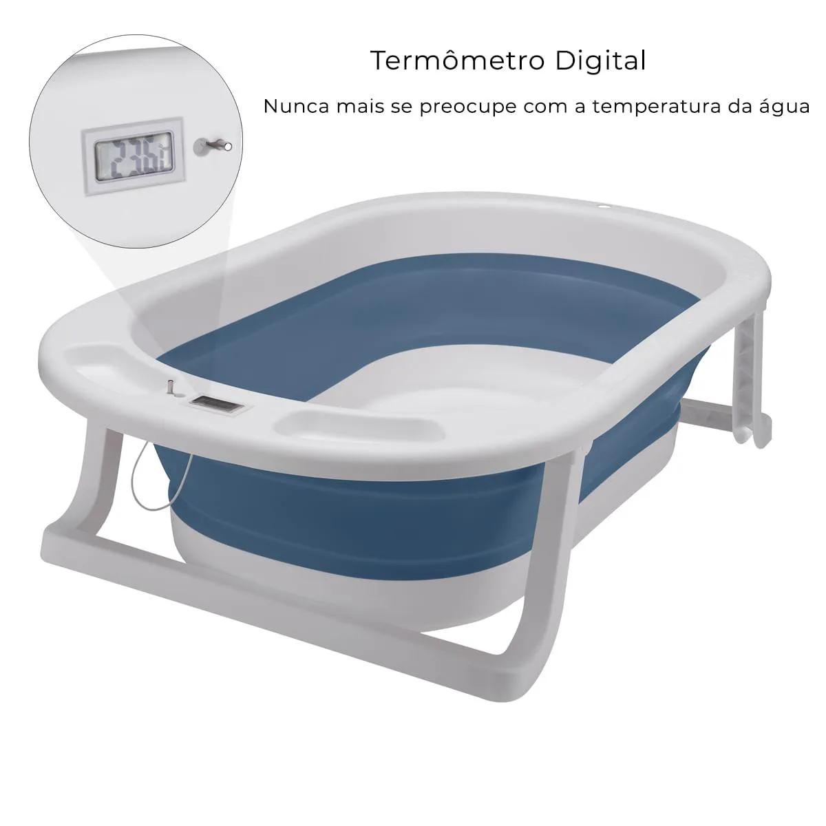 Banheira Portátil infantil com Termômetro Digital Azul Awiki Apresentamos a Banheira Portátil Infantil Awiki, a solução perfeita para banhos seguros e confortáveis para seu pequeno. Projetada para crianças do nascimento até os 6 anos, a Awiki garante que seu bebê tenha uma banheira com espaço apropriado conforme ele cresce! Ideal para usar em casa ou levar em viagens, ela foi desenvolvida com um design inteligente e inovador. Feita em polipropileno de alta resistência e silicone flexível, ela é dobrável e possui fechamento super compacto, tornando seu armazenamento muito mais prático, otimizando espaço em sua casa. Equipada com dois suportes antiderrapantes, esta banheira garante que seu bebê permaneça seguro e estável durante o banho. Além disso, pensando no bem-estar e saúde do seu filho, ela conta com um termômetro para você nunca mais se preocupar com a temperatura da água. Com o termômetro digital integrado, você pode garantir que seu bebê não seja exposto a água acima da temperatura ideal! Ela também possui válvula para o escoamento da água e dois suportes para shampoo e sabonete. Sua base é antiderrapante, mas, não deve ser utilizada em superfícies elevadas para evitar acidentes! Dê ao seu bebê uma experiência de banho mais segura e prática, sem comprometer o conforto. Adquira a Banheira Portátil Infantil Awiki e torne os momentos de banho ainda mais especiais! Principais Características: