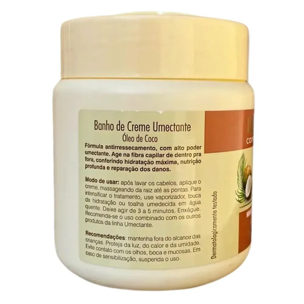 Banho de Creme Bio Extratus Umectante Óleo de Coco 250g Fórmula antirressecamento, com alto poder umectante. Age na fibra capilar de dentro pra fora, conferindo hidratação máxima, nutrição profunda e reparação dos danos. 0% petrolatos e parabenos. Liberado para Low Poo. pH 4,0. . Modo de Uso Após lavar os cabelos, aplique o creme, massageando da raiz até as pontas. Para intensificar o tratamento, use vaporizador, touca de hidratação ou toalha umedecida em água quente. Deixe agir de 3 a 5 minutos. Enxágue. Recomenda-se o uso combinado com os outros produtos da linha Umectante. . Perguntas Frequentes: Qual é a função do Banho de Creme Bio Extratus Umectante Óleo de Coco? O Banho de Creme Bio Extratus Umectante Óleo de Coco tem a função de proporcionar hidratação intensa e nutrição profunda aos fios, com o poder do óleo de coco. Ele age restaurando a maciez e o brilho, especialmente em cabelos secos e danificados. Qual a frequência de uso recomendada? O Banho de Creme pode ser usado uma vez por semana para hidratar profundamente os fios. Se seu cabelo estiver muito danificado ou ressecado, pode ser usado mais vezes, dependendo da necessidade. O Banho de Creme tem algum cheiro forte? O produto tem um aroma suave e agradável de coco, que deixa os fios com um cheiro delicado e fresco, mas sem ser excessivo. Quanto tempo o Banho de Creme deve ficar no cabelo? O tempo recomendado é de 5 a 10 minutos, mas você pode deixar um pouco mais, caso sinta que seu cabelo precisa de uma hidratação mais profunda. Posso usar o Banho de Creme no cabelo seco? O Banho de Creme deve ser aplicado após o shampoo, no cabelo úmido. Para obter o melhor resultado, ele deve ser aplicado após a limpeza para garantir que os fios absorvam bem a hidratação. . Código de Registro Sanitário (ANVISA) 25351.384864/2018-51