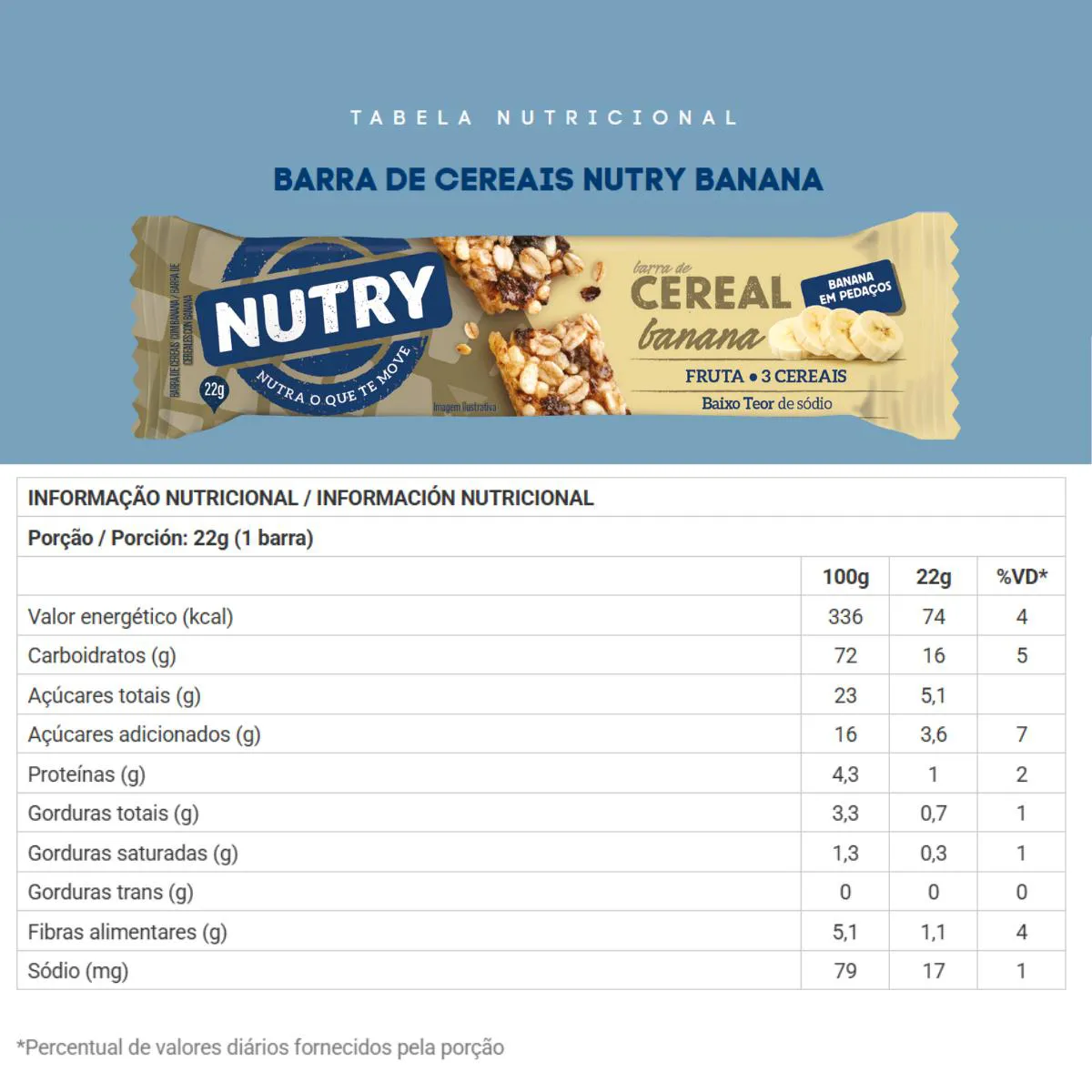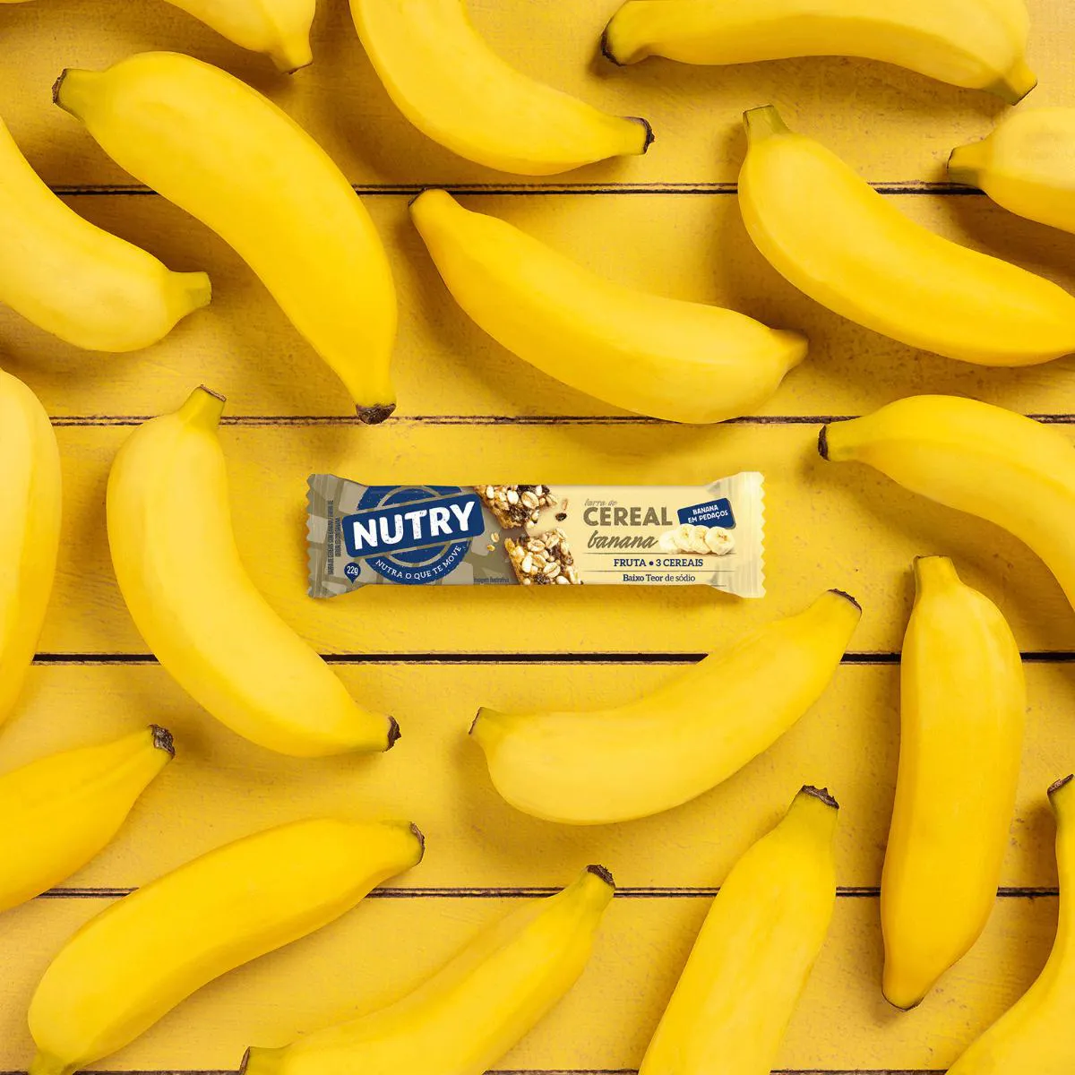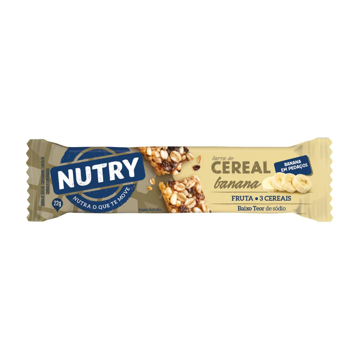 A Barra de Cereal Nutry agora com banana em pedaços. Ingredientes: Cereais (aveia e flocos de cereais*), glicose de milho, banana, açúcar invertido, gordura vegetal, sal, estabilizante polidextrose, antioxidantes lecitina de soja e mistura de tocoferóis. *Arroz e milho. Alérgicos: Contém aveia, derivados de cevada e soja. Pode conter amêndoa, amendoim, avelã, castanha-de-caju, castanha-do-Brasil, centeio, látex natural, leite, macadâmia, nozes, pecãs, pistache e trigo. Contém glúten.