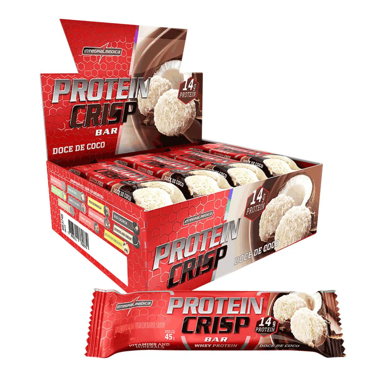 Deu vontade de comer doce sem sair da dieta? Protein Crisp Integralmédica é a barra de proteína com 13 g de proteína e baixa caloria. . Ótima fonte de vitaminas, minerais e fibras, ajuda a saciar a fome e evitar o catabolismo. A Protein Crisp é uma barra de proteína completa, unindo ótima qualidade na composição de seus ingredientes com praticidade de consumo. Tem ótima digestão é excelente para quem busca uma opção saudável de alimento proteico para incluir em dietas de variados objetivos como: aumento de massa magra e reposição de proteínas. Pode facilmente ser utilizada como substituto de alimentos doces, tendo textura macia e crocante. Protein Crisp é formulada com whey protein pode ser consumida no pré e pós treino, entre as refeições (lanches intermediários) e substituta de sobremesas. Ingredientes: Blend Proteico [caseinato de Cálcio, Proteína Hidrolisada (colágeno), Proteína Isolada do Soro de Leite, Proteína Concentrada do Leite, Proteína Concentrada do Soro de Leite], Recheio de Coco, Cobertura Sabor chocolate Ao Leite, Xarope de Maltitol, Xarope de Frutose, Óleo de Palma, Fruto-oligossacarídeo, Crisp Isolado de Soja, Mix de Vitaminas [vitamina a (palmitato de Retinol), vitamina d (colecalciferol), vitamina e (acetato de Tocoferol), vitamina c (ácido Ascórbico), Vitamina B1 (tiamina Mononitrato), Vitamina B2 (riboflavina), Vitamina B6 (piridoxina), Vitamina B12 (cianocobalamina), Vitamina h (biotina), Vitamina Pp (nicotinamida), Ácido Fólico e Vitamina B5 (pantotenato de Cálcio)], Mix de Minerais (sulfato de Manganês, Cromo e Sulfato de Cobre), Cloreto de Sódio, Glicerina (umectante), Lecitina de Soja (emulsificante), Aroma Idêntico Ao Natural e Sorbato de Potássio (conservante). Contém Derivados de Leite e Soja, e Pode Conter Amendoim, Avelã, Castanha de Cajú e Castanha do Pará.