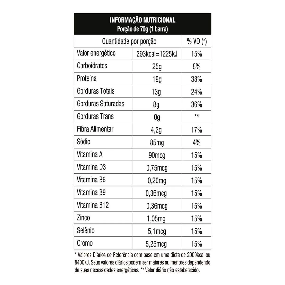 Blend proteico (caseinato de ca#769;lcio, protei#769;na concentrada do soro do leite, protei#769;na isolada do soro do leite), cobertura de chocolate meio amargo e recheio cremoso de chocolate branco com coco [o#769;leo vegetal, glicose, cacau, amido de milho, soro de leite, emulsificantes lecitina de soja e poliglicerol polirricinoleato de glicerina, aroma ide#770;ntico ao natural, espessante pectina, coco desidratado], sorbitol, pepti#769;deos de cola#769;geno, polidextrose, o#769;leo de palma, coco desidratado, fruto-oligossacari#769;deos, Orafti® Synergy1 (inulina), umectante glicerina, mix de vitaminas [A (acetato de retinol), D3 (colecalciferol), B6 (piridoxina hcl), B9 (a#769;cido fo#769;lico), B12 (cianocobalamina)] e minerais [zinco (sulfato de zinco), sele#770;nio (selenito de so#769;dio), cromo (picolinato de cromo)], aromas ide#770;nticos aos naturais, cloreto de so#769;dio, emulsificante lecitina de girassol, conservantes sorbato de pota#769;ssio e benzoato de so#769;dio, antioxidante natural tocoferol.