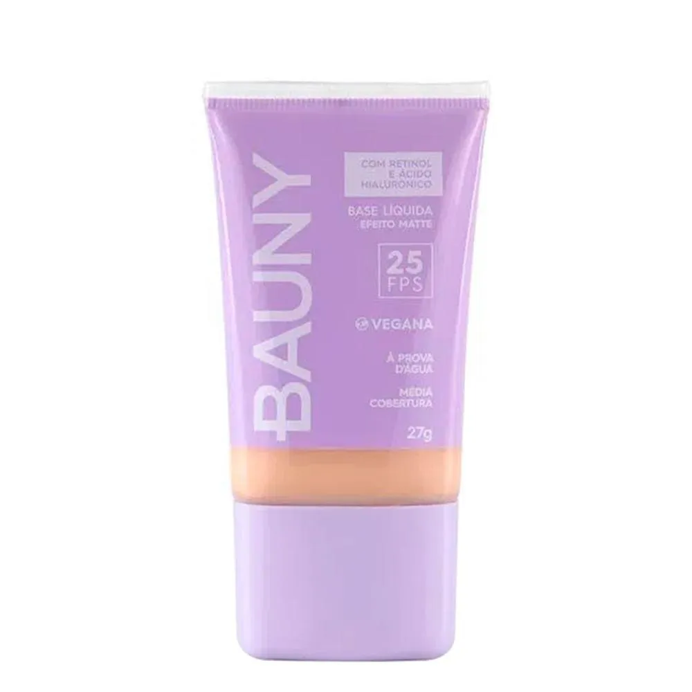 A Base líquida com efeito matte da Bauny possui média cobertura, FPS 25 contra raios UVA e UVB, ativo antipoluição digital e urbana e resistência à prova d’ água. Uniformiza a pele e possui em sua formulação ativos como ácido hialurônico, um potente repositor de água na pele e retinol, um derivado da vitamina A conhecido pelo combate ao envelhecimento, que atua promovendo a renovação celular da pele, reduzindo linhas e rugas, além de turbinar a luminosidade, aumentar a firmeza e diminuir os poros. Produto vegano.