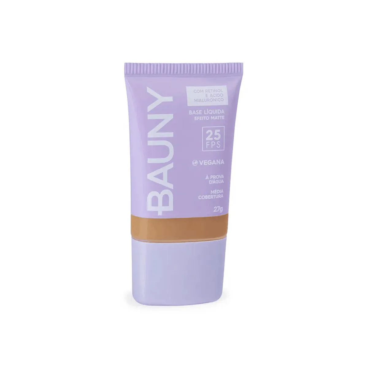 A Base líquida com efeito matte da Bauny possui média cobertura, FPS 25 contra raios UVA e UVB, ativo antipoluição digital e urbana e resistência à prova d’ água. Uniformiza a pele e possui em sua formulação ativos como ácido hialurônico, um potente repositor de água na pele e retinol, um derivado da vitamina A conhecido pelo combate ao envelhecimento, que atua promovendo a renovação celular da pele, reduzindo linhas e rugas, além de turbinar a luminosidade, aumentar a firmeza e diminuir os poros. Produto vegano.