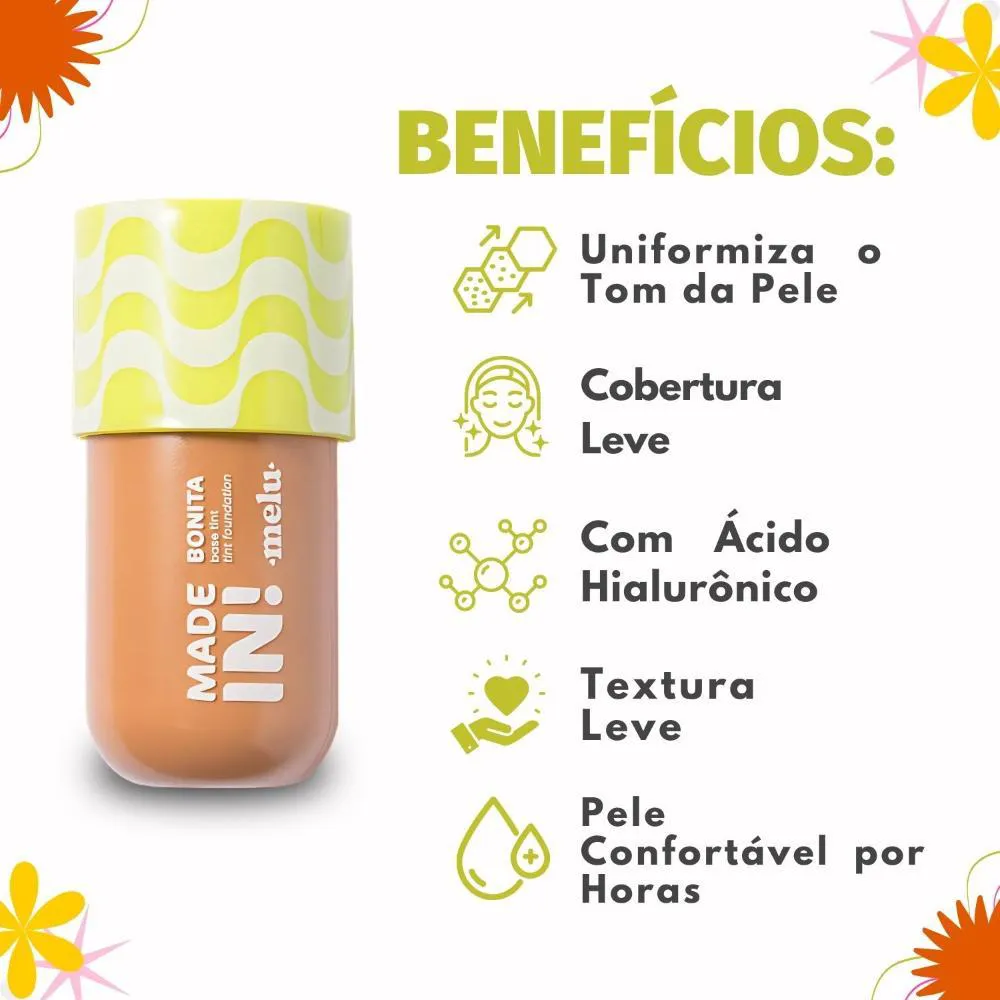 Base Tint Melu Made In! Bonita Tint Foundation Cor 90: Cobertura Leve e Acabamento Natural para Todos os tipos de pele