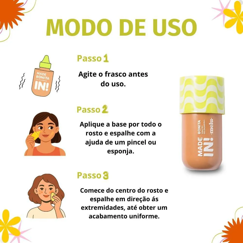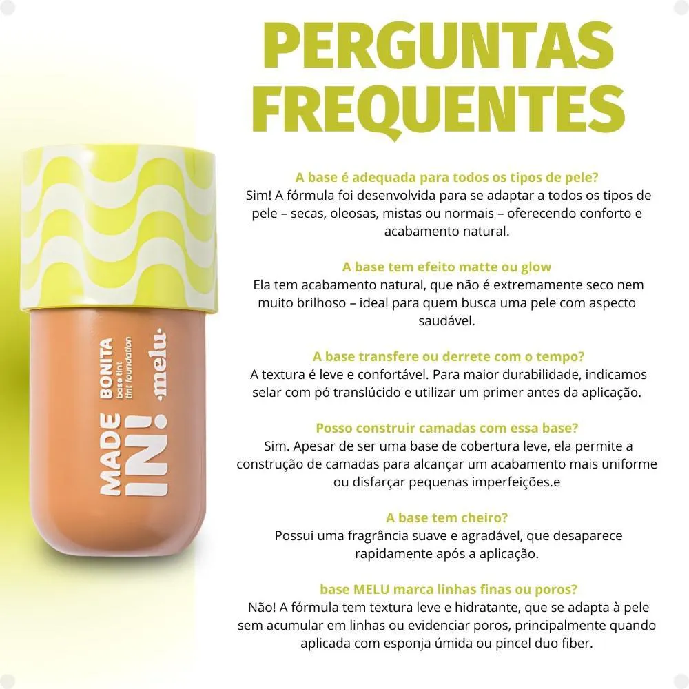 todos os tipos de pele.Com a Base Tint Bonita, você conquista um visual impecável e saudável, sem abrir mão do conforto. É a escolha perfeita para quem deseja realçar a beleza natural com um toque de cuidado.