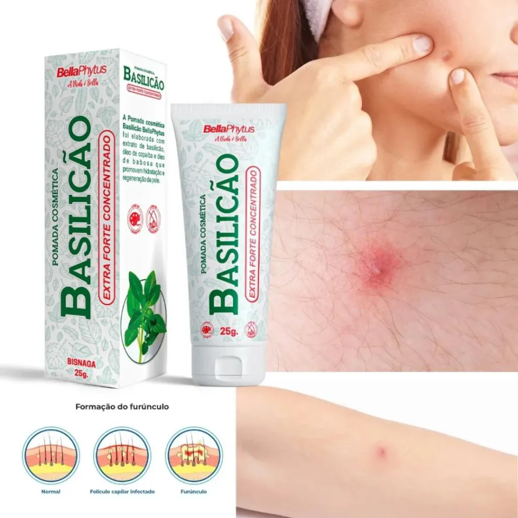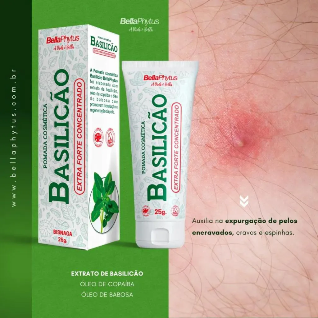 A Pomada Basilicão BellaPhytus promove hidratação e regeneração da pele, além de auxiliar na expurgação de pelos encravados, cravos e espinhas.
