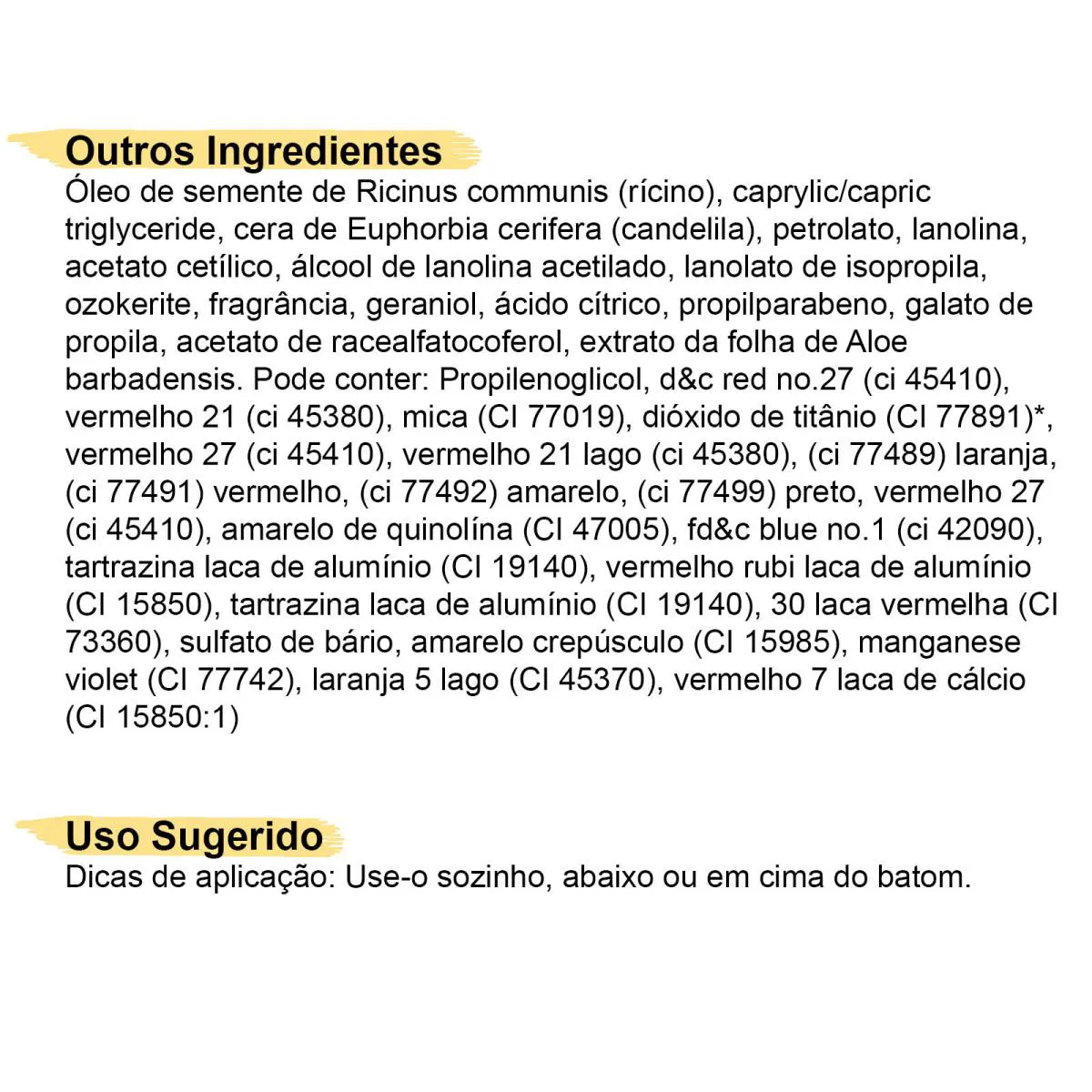 Óleo de rícino, Aloe barbadensis, Vitamina E, ceras e pigmentos cosméticos autorizados. (Lista completa disponível na embalagem.)