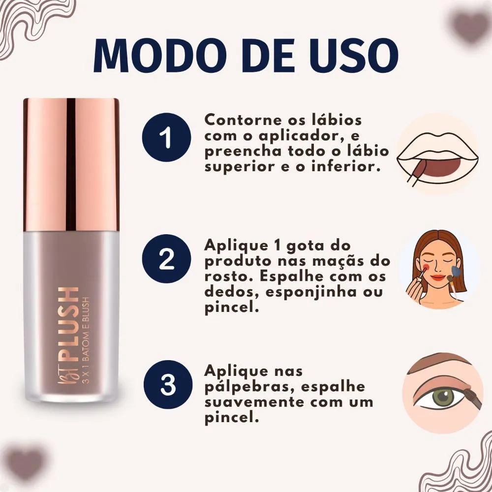 O Batom, Blush e Sombra Bruna Tavares Bt Plush 3x1 Latte Bps14b é perfeito para o uso diário, proporcionando uma maquiagem rápida e eficiente. Ideal para viagens, retoques ao longo do dia, looks casuais ou eventos especiais. Use-o para um look natural no trabalho, um toque de cor em um encontro ou uma produção elaborada em eventos.Modo de Uso/Aplicação