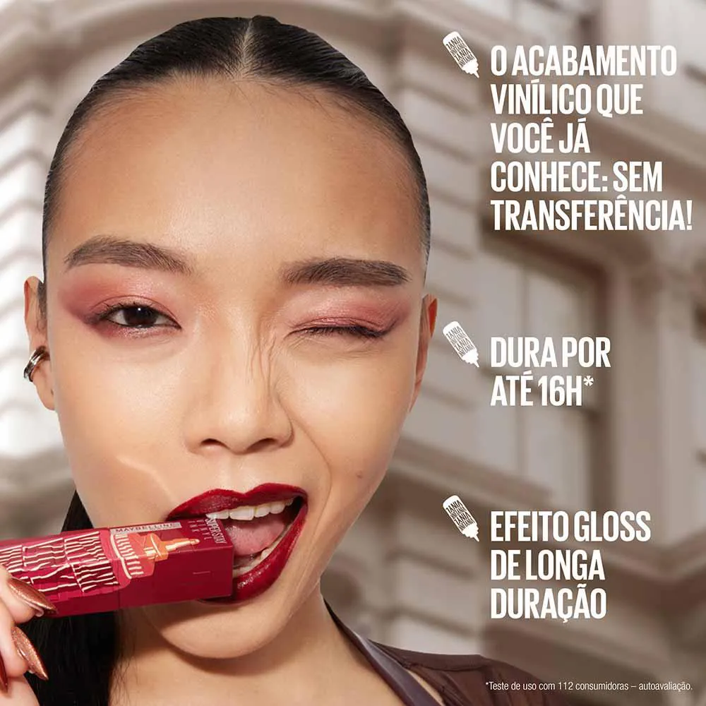 Este batom combina a intensidade de uma tinta vinílica com o conforto de uma fórmula leve, proporcionando lábios deslumbrantes por até 16 horas sem necessidade de retoques. Ideal para ocasiões em que você precisa estar impecável, ele garante um visual marcante durante todo o dia.