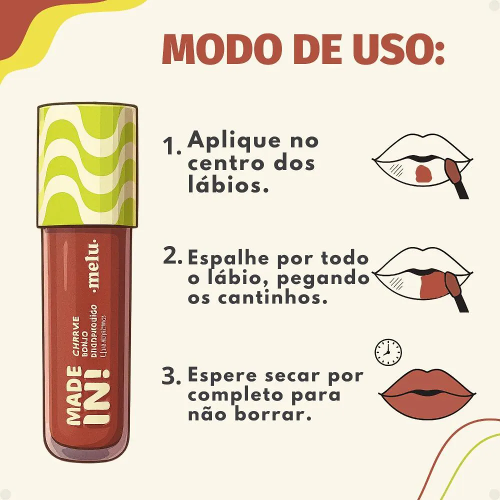 Para uma aplicação perfeita do seu Batom Líquido Melu Made In! Charme Do Rio Ipanema RR-L6202-8:• Certifique-se de que seus lábios estejam limpos e secos.• Com o aplicador, comece delineando o contorno dos lábios, do centro para as extremidades.• Preencha o restante dos lábios com uma camada uniforme do batom.• Para um efeito mais intenso, aplique uma segunda camada após a primeira secar levemente.