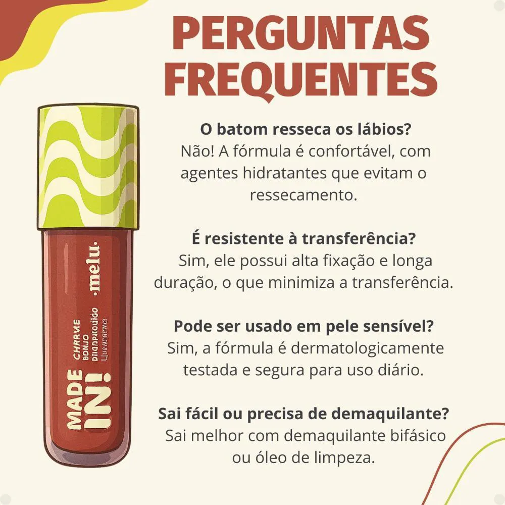 Para manter a qualidade do seu Batom Líquido Melu Made In! Charme Do Rio Ipanema RR-L6202-8 e garantir uma remoção eficaz:• Armazene em local fresco e seco, longe da luz solar direta.• Feche bem a embalagem após o uso para evitar o ressecamento do produto.• Para remover, utilize um demaquilante bifásico ou água micelar, aplicando suavemente com um algodão até a completa remoção. . Código de Registro Sanitário (ANVISA) 25351.396633/2024-39