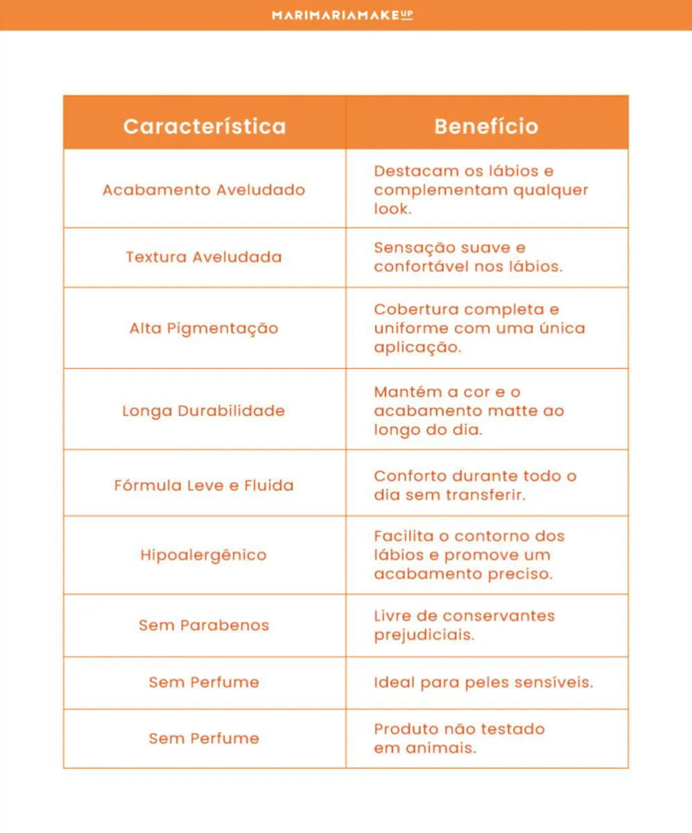 lábios vibrantes, textura confortável e efeito matte sofisticado Sinta a potência de um batom que entrega pigmentação intensa, acabamento aveludado e conforto extremo! O Batom Creamy Matte da Mari Maria une tudo o que você ama: cores marcantes, textura leve e uma fórmula que hidrata enquanto colore. Enriquecido com manteiga de karité, ácido hialurônico e extrato de chá verde, ele cuida da pele dos lábios e garante um visual matte sem ressecar. Perfeito para quem ama beleza com performance! Destaques do produto