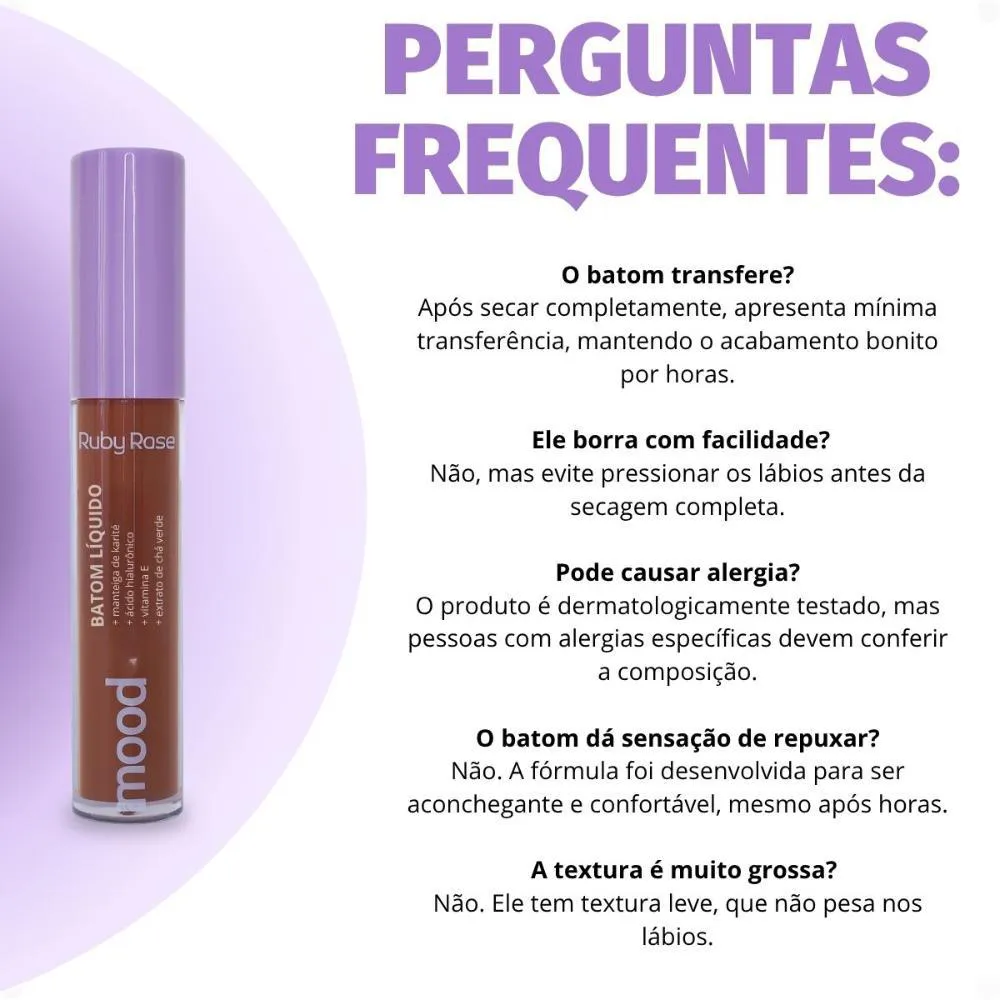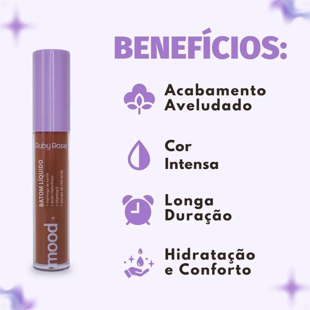 Dê vida aos seus lábios com o Batom Líquido Ruby Rose Mood, a arma secreta para um visual impactante e cheio de personalidade. Imagine seus lábios adornados com uma cor intensa e um acabamento impecável que dura o dia todo. Este batom não apenas realça sua beleza, mas também cuida dos seus lábios, proporcionando uma sensação de conforto e hidratação. Ideal para mulheres que desejam expressar sua individualidade e confiança em cada sorriso. Prepare-se para elevar sua maquiagem a um novo patamar com este batom que une beleza, cuidado e durabilidade em um único produto. Experimente a sensação de lábios irresistíveis e um visual que atrai olhares por onde você passar.Benefícios Principais