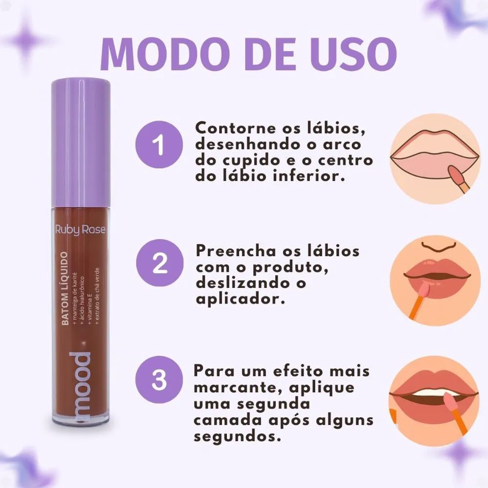 Aplique o Batom Líquido Ruby Rose Mood diretamente nos lábios, começando pelo centro e seguindo para as extremidades. Utilize o aplicador para contornar os lábios e preencher o restante da área. Para um efeito mais intenso, aplique uma segunda camada.Anvisa: 25351.652442/2022-09