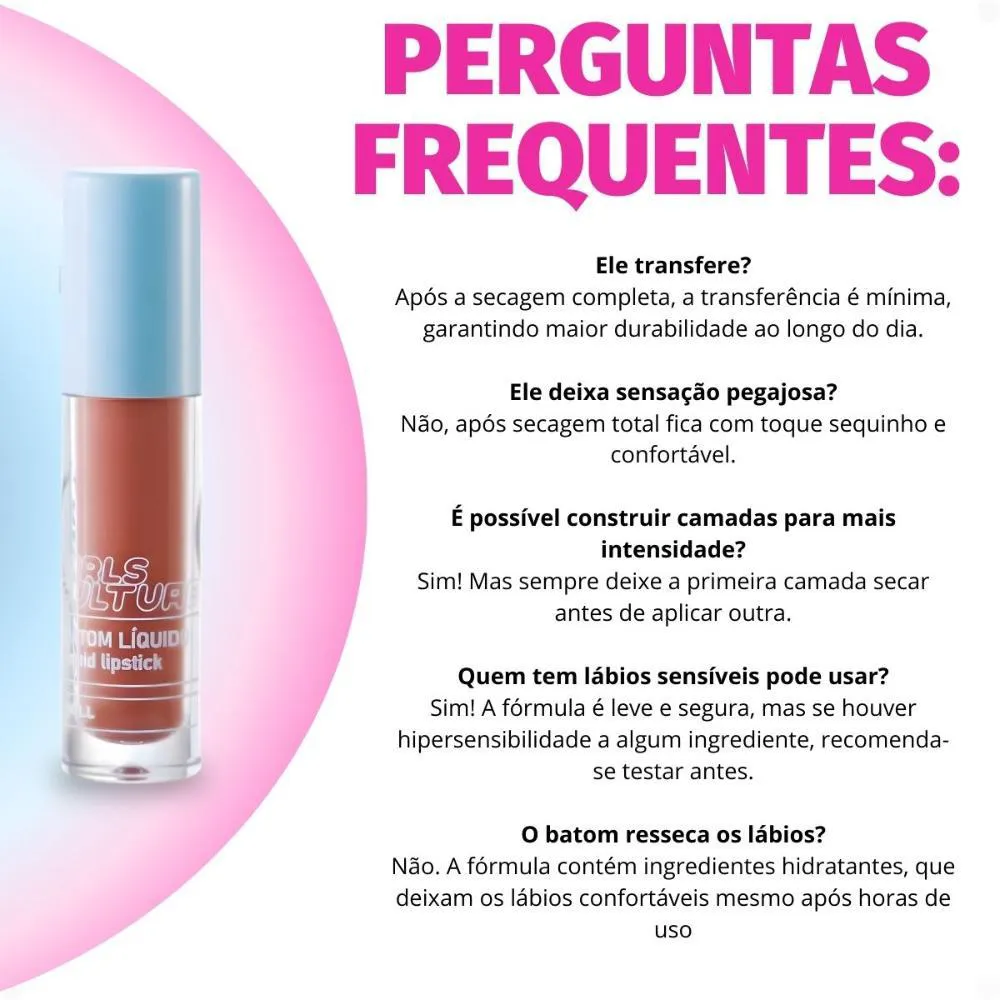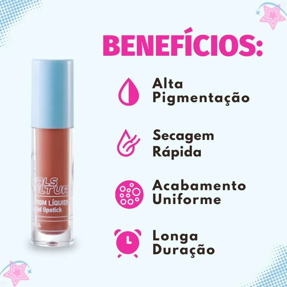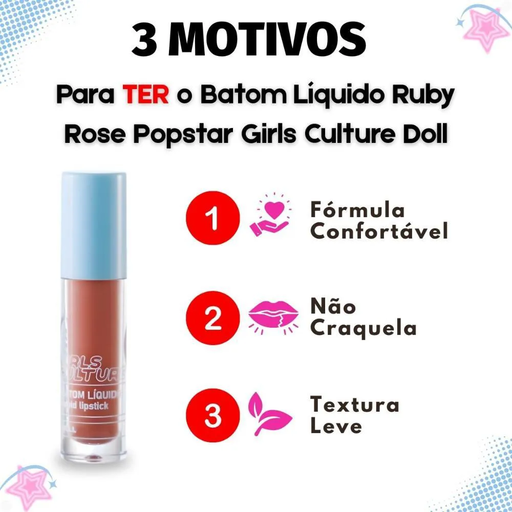 Descubra o Batom Líquido Ruby Rose Popstar Girls Culture, o item perfeito para quem busca um toque de cor vibrante e estilo em sua maquiagem. Desenvolvido pela renomada marca RUBY ROSE, este batom líquido oferece uma experiência única, ideal para expressar sua personalidade e paixão pela cultura pop. Com uma fórmula pensada para proporcionar conforto e beleza, ele se torna um aliado indispensável para looks marcantes e cheios de atitude, permitindo que você brilhe em qualquer ocasião. Ideal para jovens e adultos que amam maquiagem e querem se destacar com um visual moderno e divertido.Benefícios Principais
