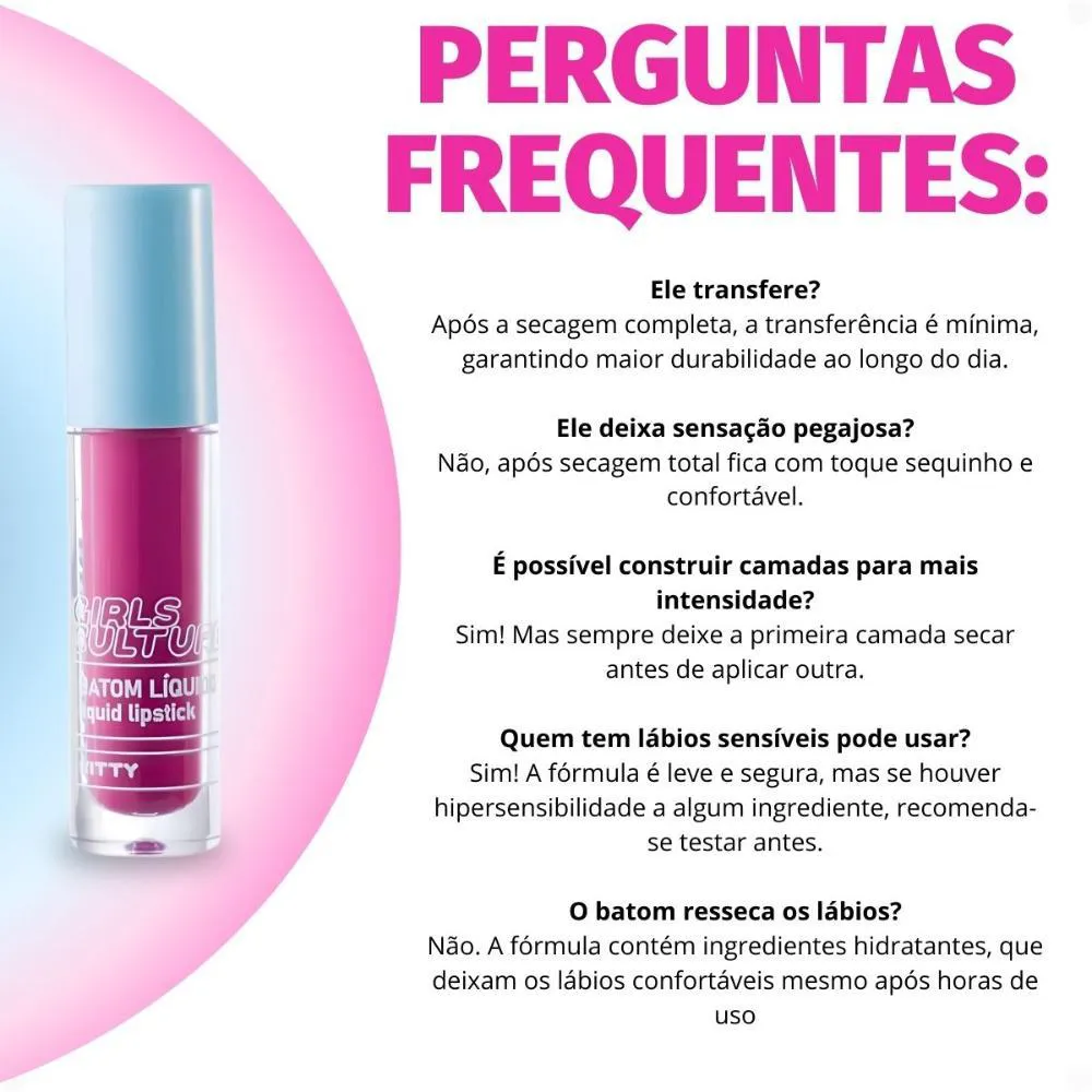 Descubra o Batom Líquido Ruby Rose Popstar Girls Culture, o item perfeito para quem busca um toque de cor vibrante e estilo em sua maquiagem. Desenvolvido pela renomada marca RUBY ROSE, este batom líquido oferece uma experiência única, ideal para expressar sua personalidade e paixão pela cultura pop. Com uma fórmula pensada para proporcionar conforto e beleza, ele se torna um aliado indispensável para looks marcantes e cheios de atitude, permitindo que você brilhe em qualquer ocasião. Ideal para jovens e adultos que amam maquiagem e querem se destacar com um visual moderno e divertido.Benefícios Principais