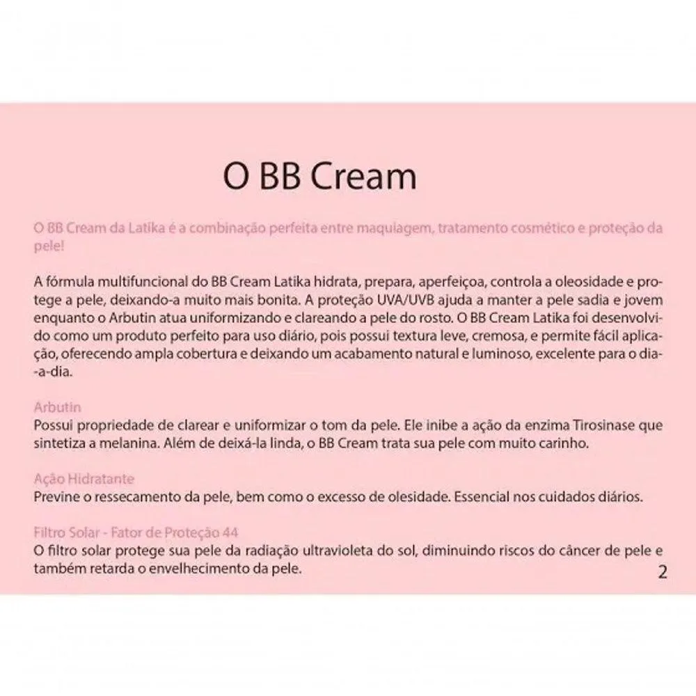 BB cream para todos os tipos de pele. Latika BB Cream Whitening possui fórmula clareadora que uniformiza o tom e a textura, protege dos raios UV com FPS 44, clareia as manchas, hidrata e confere acabamento natural e leve.O BB Cream Latika reúne em um só produto diversas funcionalidades. Ingredientes clareadores deixam a cor da pele mais uniforme e igualada, controla a oleosidade, oferece alta proteção aos raios solares e hidratação sem deixar o rosto com o aspecto oleoso por ser oil-free.Além de deixar a pele linda o dia inteiro, BB Cream Latika Whitening é a escolha certa para preservar a saúde da pele e protegê-la dos raios solares de forma eficiente.