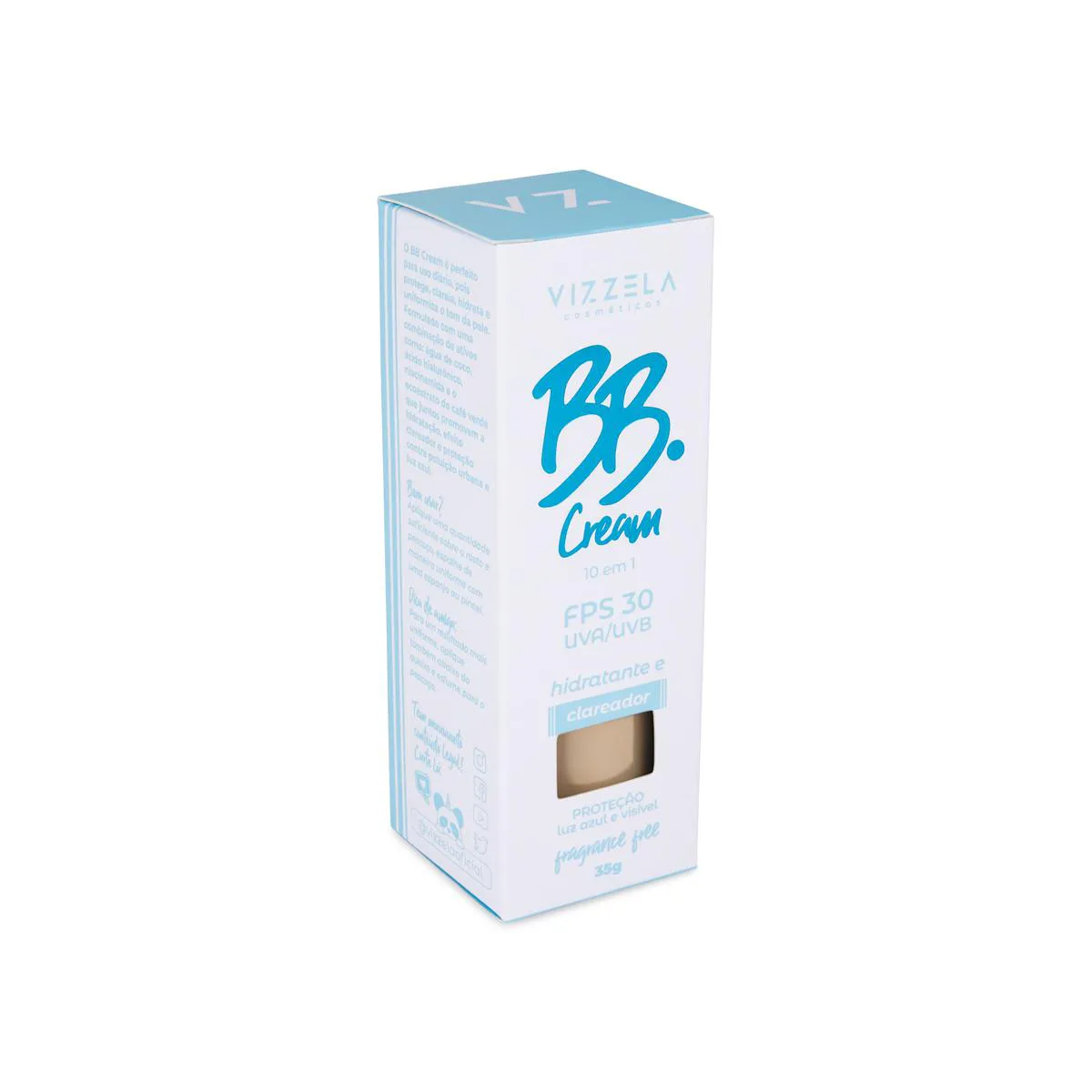 Conheça os 10 benefícios do BB Cream Vegano Vizzela 10 em 1: - FPS 30 com proteção contra raios UVA/UVB - Possui Ácido Hialurônico, deixando a pele hidratada - Efeito soft focus - Oil Free - Toque seco - Proteção contra luz azul e luz visível, dos aparelhos eletrônicos - Sua cobertura é natural - Possui água de coco com efeito remineralizante na pele - Sua textura é leve - Suaviza imperfeições