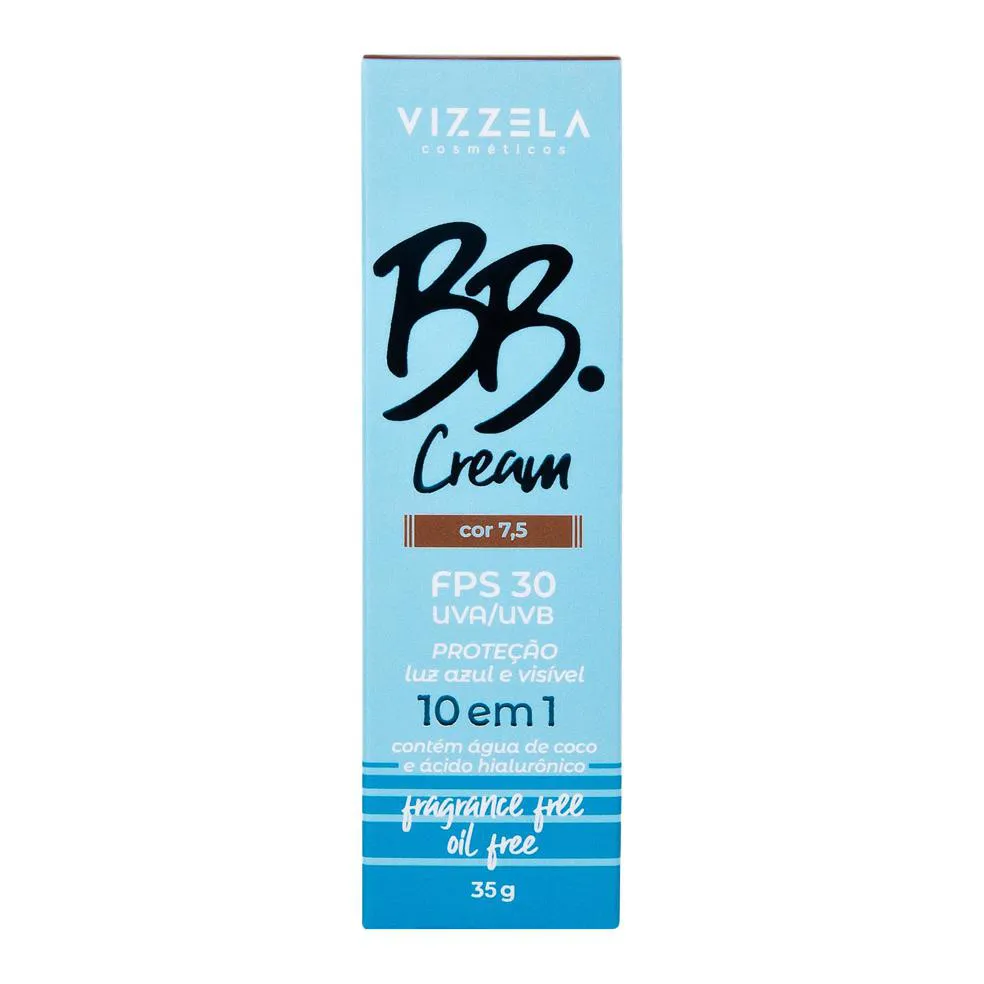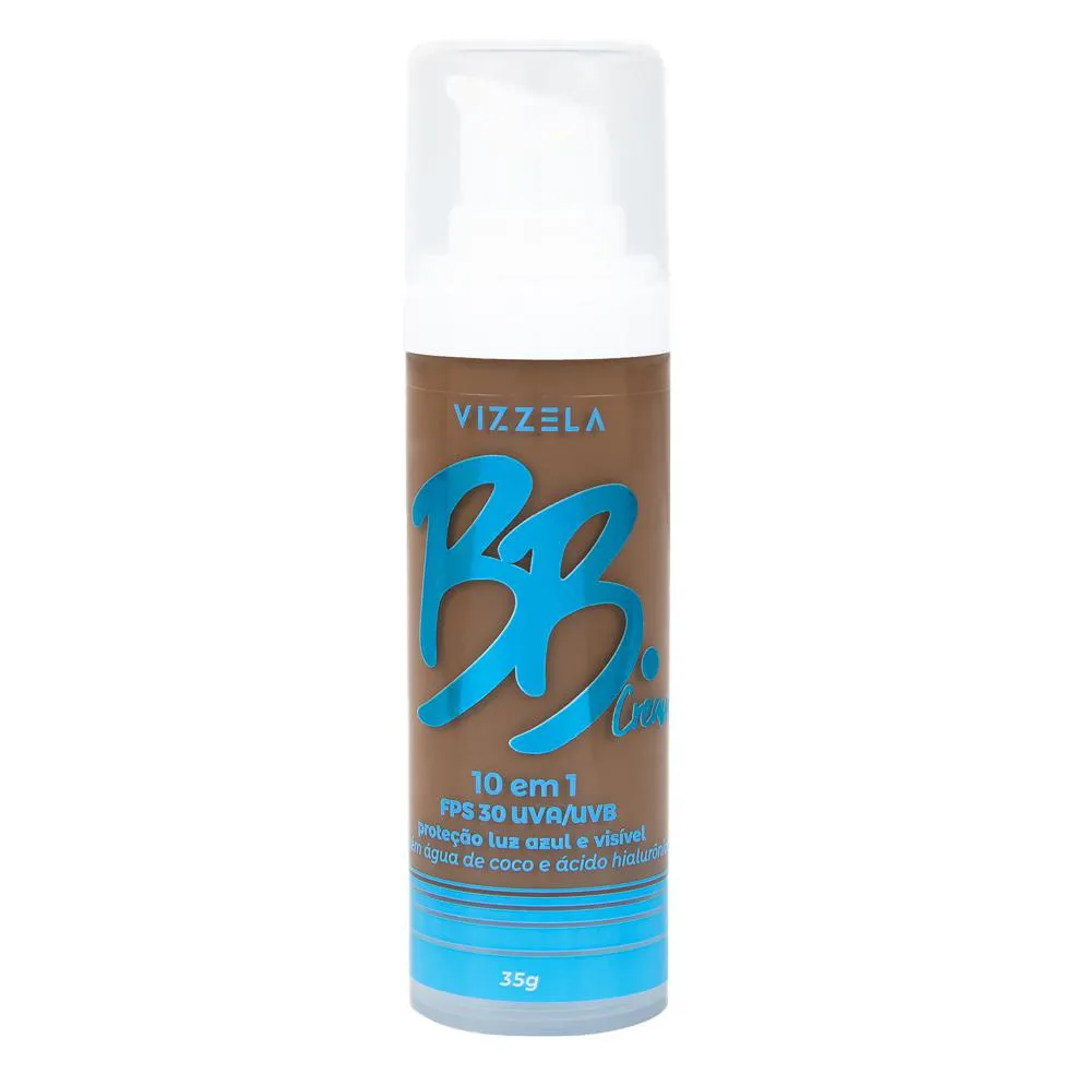 Conheça os 10 benefícios do BB Cream Vegano Vizzela 10 em 1: - FPS 30 com proteção contra raios UVA/UVB - Possui Ácido Hialurônico, deixando a pele hidratada - Efeito soft focus - Oil Free - Toque seco - Proteção contra luz azul e luz visível, dos aparelhos eletrônicos - Sua cobertura é natural - Possui água de coco com efeito remineralizante na pele - Sua textura é leve - Suaviza imperfeições